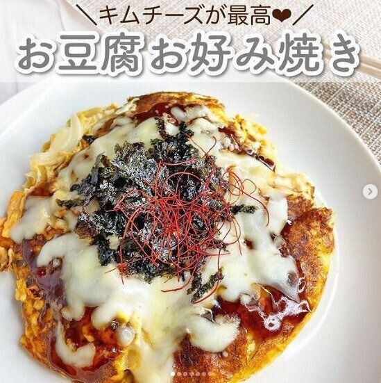 こちらは、家族も大満足の「キムチーズ豆腐お好み焼き」です。つくり方は簡単。水切りした豆腐に、卵1個、片栗粉小さじ2、キムチ、顆粒和風だしを加えてよく混ぜます。千切りキャベツを加えてさらに混ぜ、フライパンで焼けばできあがり。お好みでチーズや韓国のりをのせるのもおすすめ。キムチを生地に混ぜるのがポイントで、かけるソースは少量、あるいはなしでも十分満足できるのだそう。意外に高カロリーな調味料のかけすぎを防ぐことができますね。