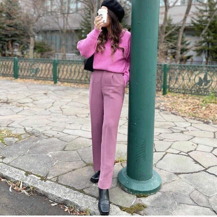 同じピンクでもボトムスにくすんだピンクを合わせることで大人のワントーンコーディネートを実現しています。