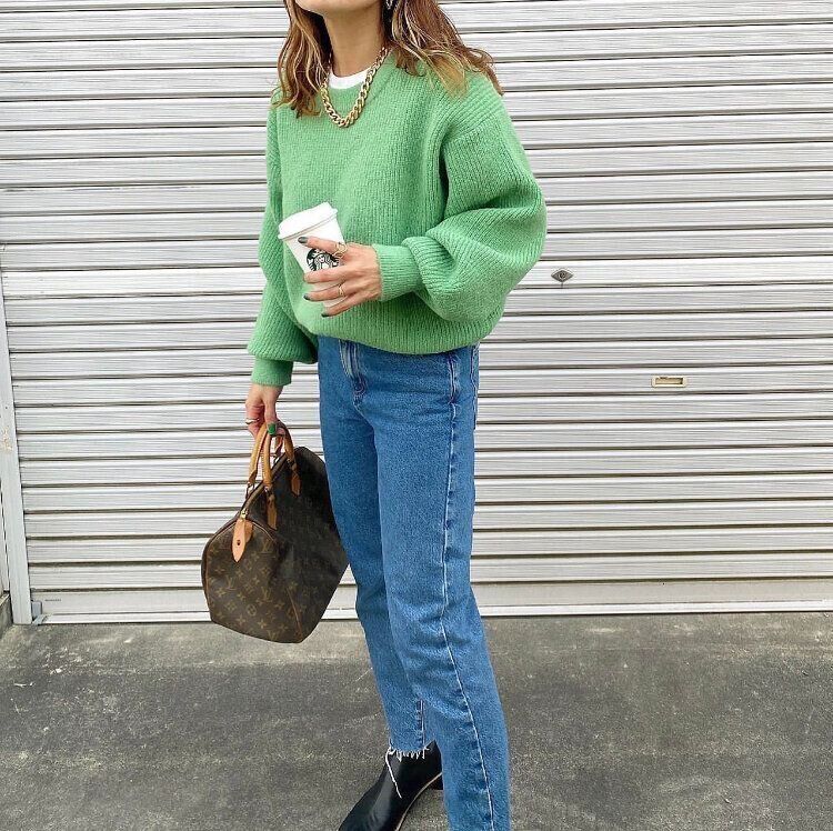 デニムはグリーンのヘアリーカラーセーターとも相性抜群!