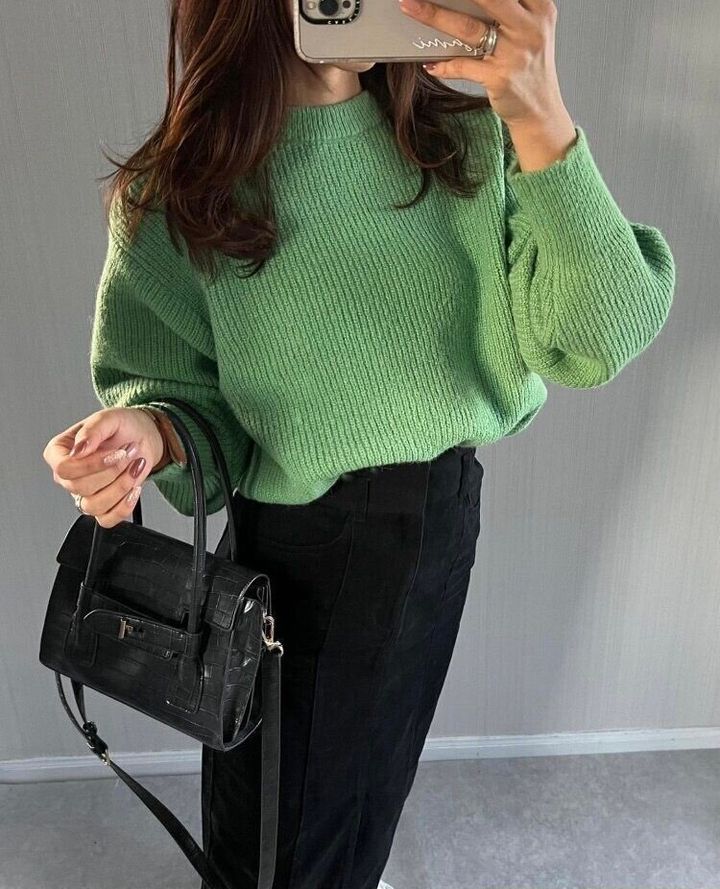 小物やボトムスをブラックで統一することで、グリーンのニットも少し落ち着いた印象になり、ニットの派手なイメージを一掃してくれます。