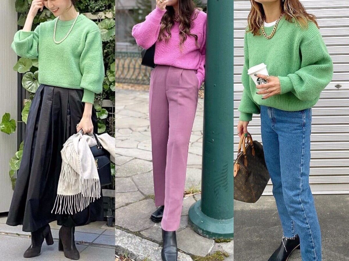 シンプルなアイテムを多く持っている人にこそおすすめのヘアリーカラーセーターの鮮やかなピンクとグリーン。手持ちのアイテムでトレンドを抑えたワンランク上のコーディネートが楽しめます。