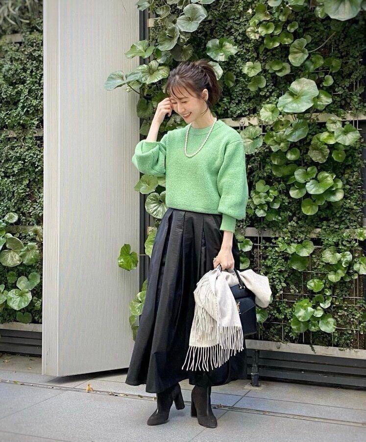こちらもグリーンのヘアリーカラーセーターにブラックのボトムスを合わせたコーディネート。ふわりと広がるスカートに合わせてもトップスがもたつかないデザインなのできれいにまとまり、スタイリッシュに。
