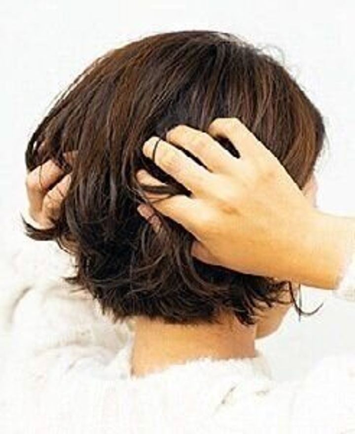 後頭部がぺたんとつぶれていると、顔が大きく見えてしまう原因に。ワックスをもみ込んでボリュームを引き出し、ふんわりと動きを出して。
