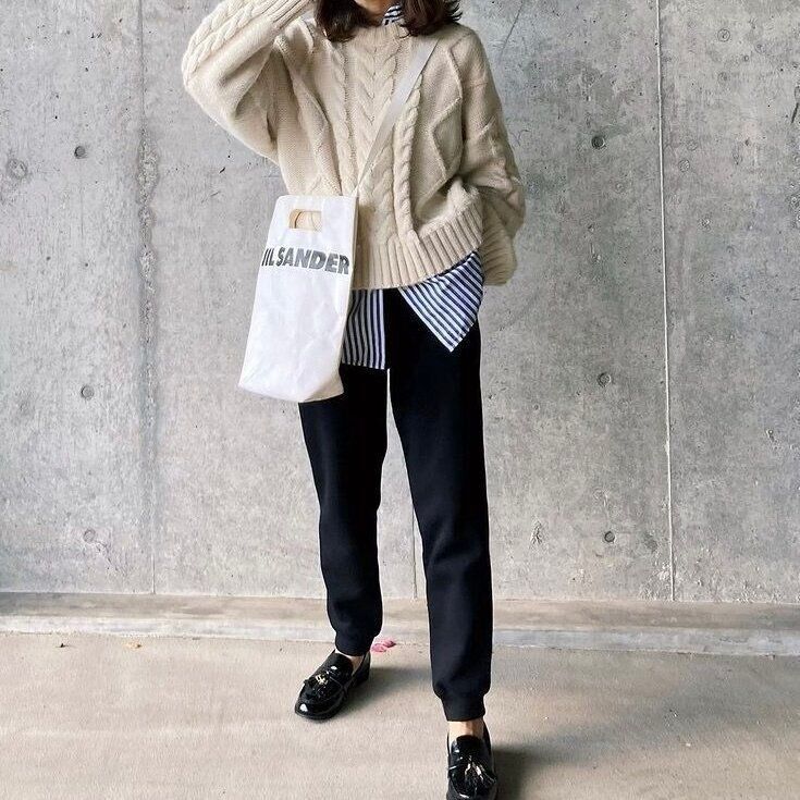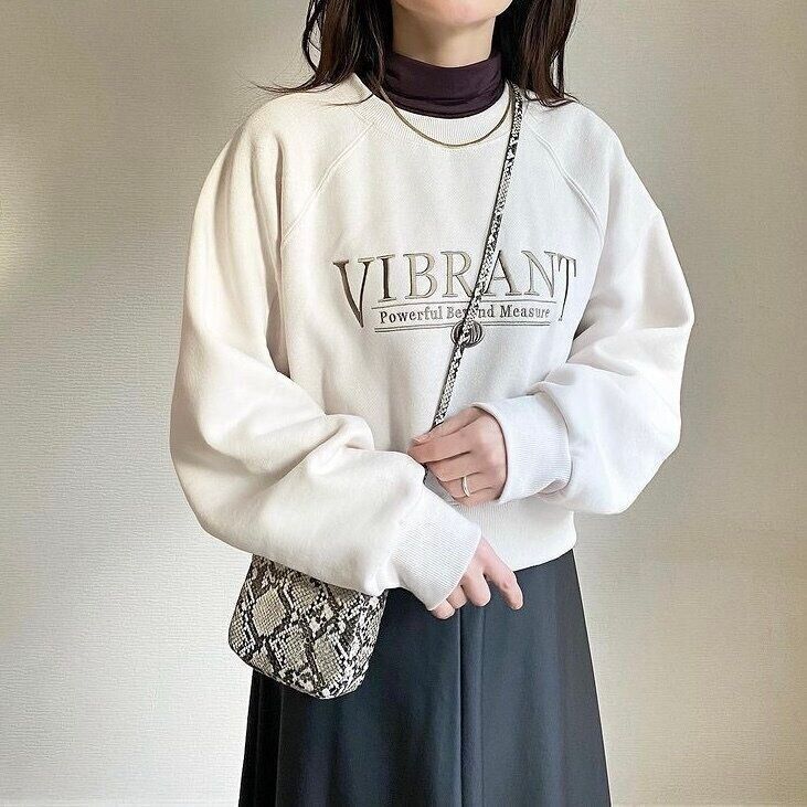 裏起毛のスウェットにはハイネックをレイヤードさせるとトレンドライクに。今まで隠すように着こなしていたインナーを、あえて見せるように首から出すと新鮮です。首元をしっかり風から守ると体感温度も上がります。寒い日のインナーは、ハイネック・タートルネックなど「見せるインナー」を視野に入れてみるのもオススメ!