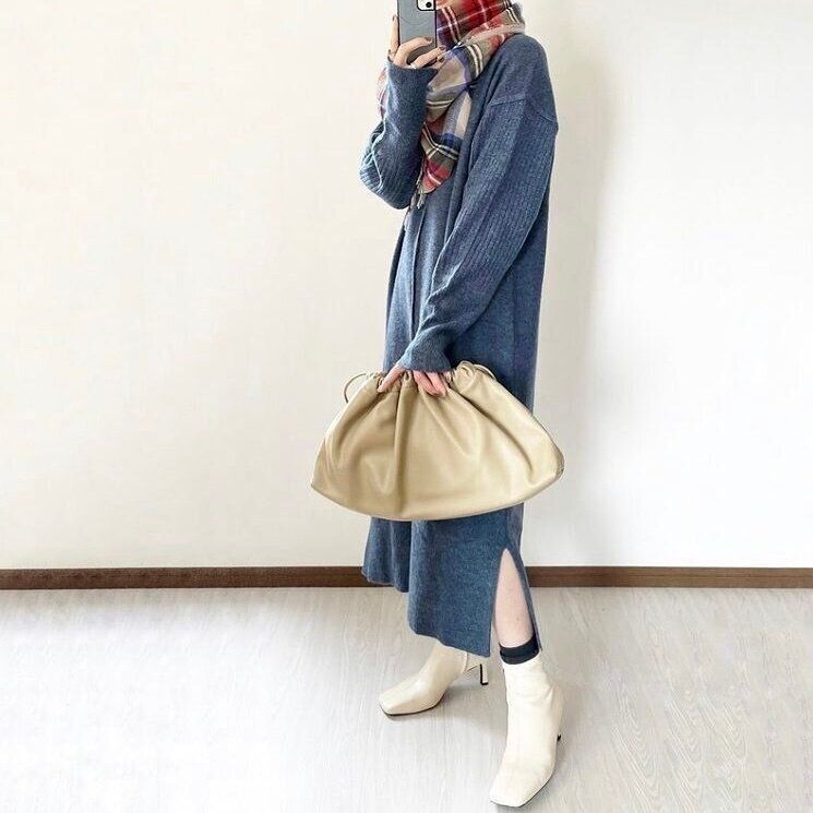 コーディネートに華やぎが増し、女っぷりも高まるニットワンピースはラクしてかわいいスタイルに欠かせないアイテム。ですが、おなかがポッコリ見えたり、少し平面的に見えてしまったりむずかしいものです。コーディネートにメリハリ感が加わるストールを足してみると、瞬時に視線が上に集まります。