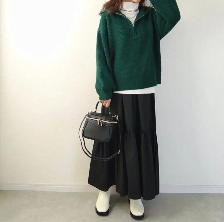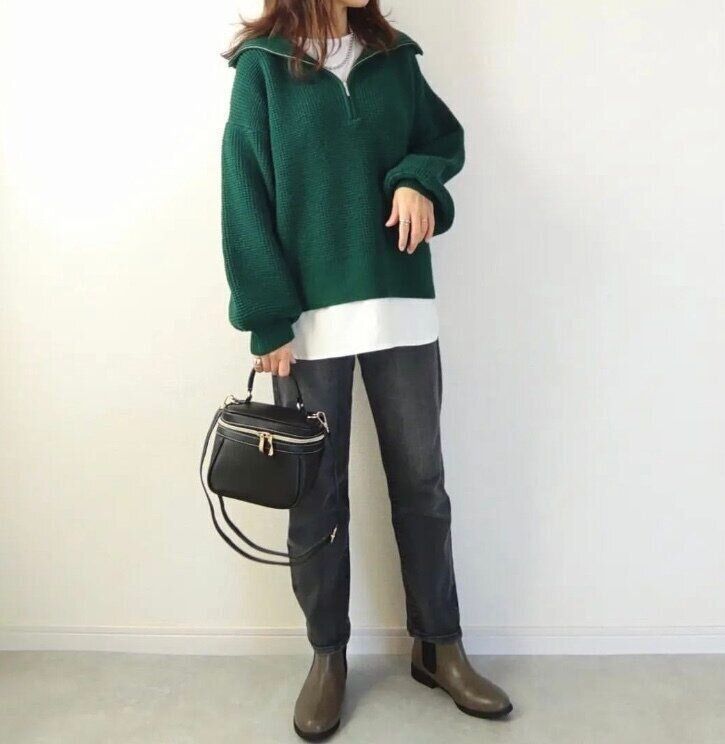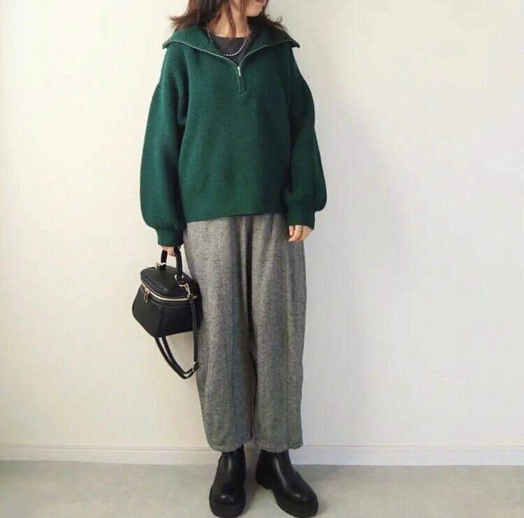 HKハーフニットPOの中でもとくに人気の高いグリーンは1枚でおしゃれ上級者の仲間入りができるのでおすすめ。寒い日はインナーにタートルネックを合わせれば防寒もでき、おしゃれにも手を抜かないキレカジコーディネートが完成します。