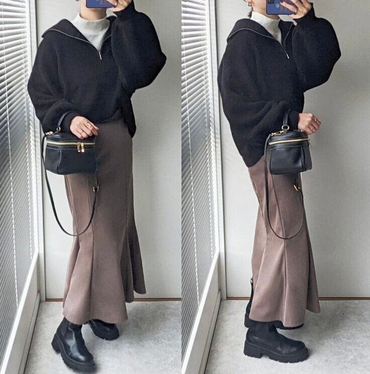 暗く見えがちなブラックですが、ジップを大きく開けることでブラックのニットの中にも明るさを取り入れてくれます。