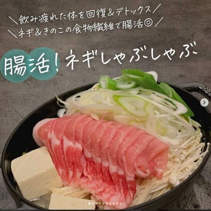 腸内環境を整えることで体は変わる!早速、yuzu_fastingさんの「腸活」レシピをご紹介しましょう。こちらは寒い冬にうれしいお鍋。ポイントは、たっぷりのネギときのこを入れること。食物繊維も豊富で「腸活」にぴったりだそう。また、豆腐は腹もちをアップさせ、イソフラボンもたっぷり。ネギときのこを豚肉で巻いてポン酢でいただきます。豚肉とポン酢で疲労回復にも。温かい食べ物は体もほっとさせてくれますね。