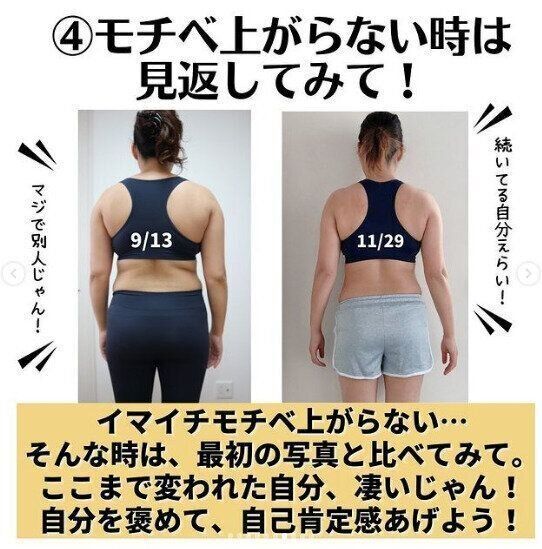 ダイエットでもっとも大事なこと、そしてもっともむずかしいことはモチベーションの維持です。どれだけがんばっても続かなければ結果は出ません。29ne.4kids_haha_dietさんがモチベーションを維持する方法としておすすめするのは「写真を撮ること」なのだそう。ダイエット前、自分の姿を客観的に見ることはだれしも嫌なこと…でも、ダイエット前の自分と今がんばっている自分の写真を比較することで、体の変化に気づき、やる気が一気にアップ!写真を撮ることは絶対におすすめだそうです!