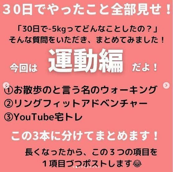 ダイエットのコツは運動編から。まず、抱っこひもで赤ちゃんを抱きながらのお散歩。ウォーキングアプリなどを使いながら、1日になんと1万歩前後を歩いているそう。次にNintendo Switchのフィットネスゲームで筋トレ!ゲーム好きだということもあり、こちらも楽しく続けることができたそう。そして3つめはトレーニング動画を見ながらの宅トレも取り入れて!この3つを継続したことが、短期間での大きな結果につながったのです。