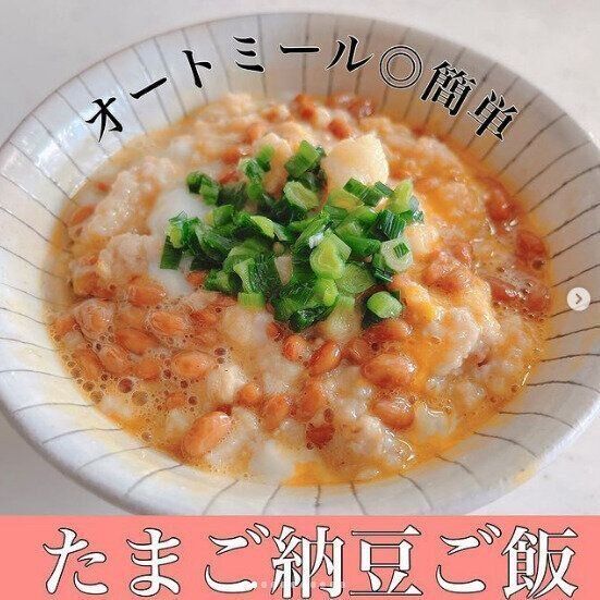 オートミールでつくる「たまご納豆ご飯」。作り方は、オートミール30g、顆粒ダシ2g、水150mlをよく混ぜて、電子レンジ(500W)で2分ほど加熱します。加熱したオートミールをかき混ぜたら卵、納豆を入れてさらに軽くかき混ぜてレンジで1分~1分半ほど加熱。小ネギ、生姜などをトッピングしてできあがり。最短で4分で完成。卵と納豆で朝ごはんにもぴったりです。