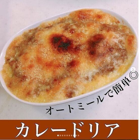 電子レンジとトースターで簡単につくれるオートミールのカレードリアです。作り方も簡単。豚肉100g、玉ねぎ50gを電子レンジ(500W)で約3分加熱します。豚肉に火がとおったら、カレールー1/4個、オートミール30g、水150mlを加えてよく混ぜます。電子レンジで3分加熱してよく混ぜます。耐熱皿にうつしてチーズをのせ、トースターで焼けばできあがり。オートミールで満腹感もばっちりです。