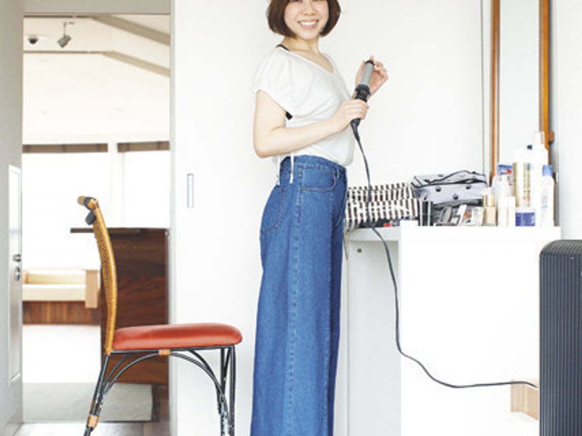 今日みたいな白いTシャツはいちばん理想的。白を着ると、ちょうど手元のあたりが明るくなるので、髪や顔の状態が確認しやすいです。白のTシャツはシンプルになりがちですが、これは肩から脇にかけてひもでディテールが施されているのがいいですね。ボトムスは、シンプルにデニムを合わせました。流行のワイドパンツですが、これは腰まわりと脚のラインがとてもスッキリしていて、背があまり高くない私でもバランスよく見えます。