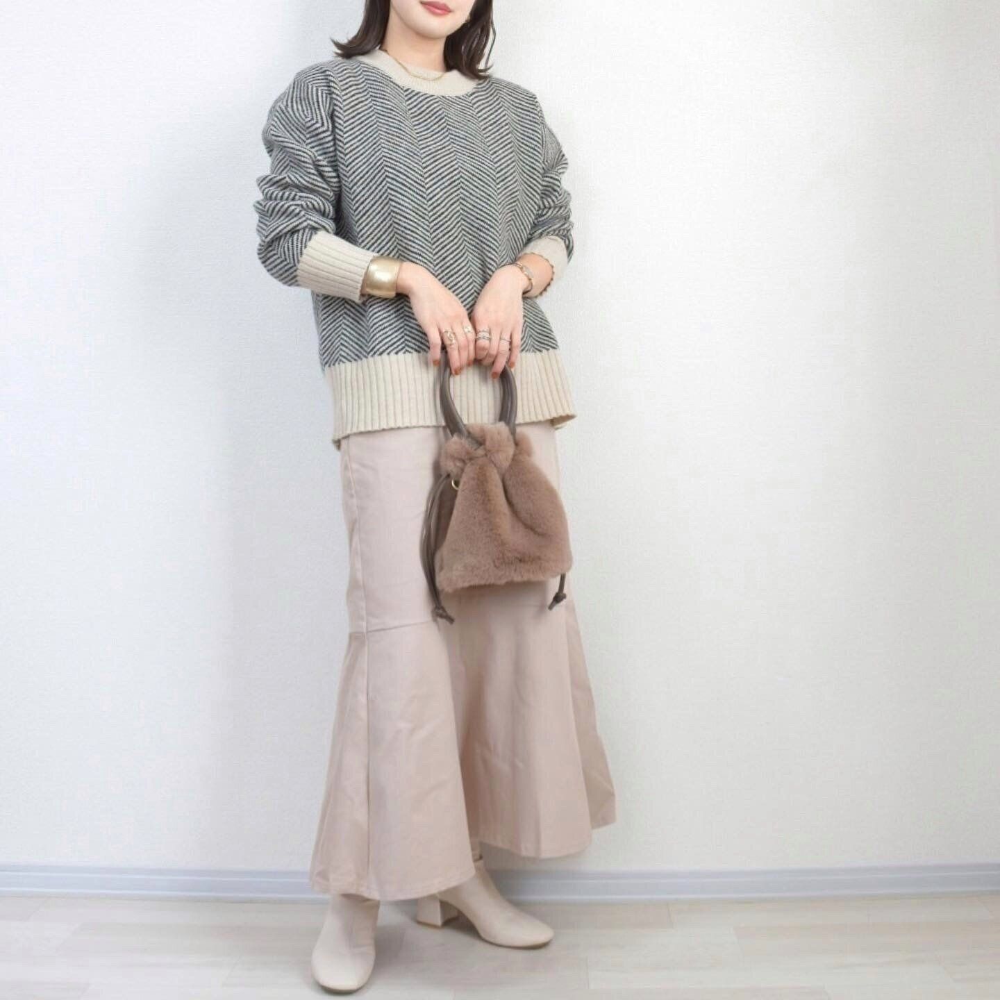 ニットの切り返し部分と同系色のものと合わせるとすっきりまとまります。