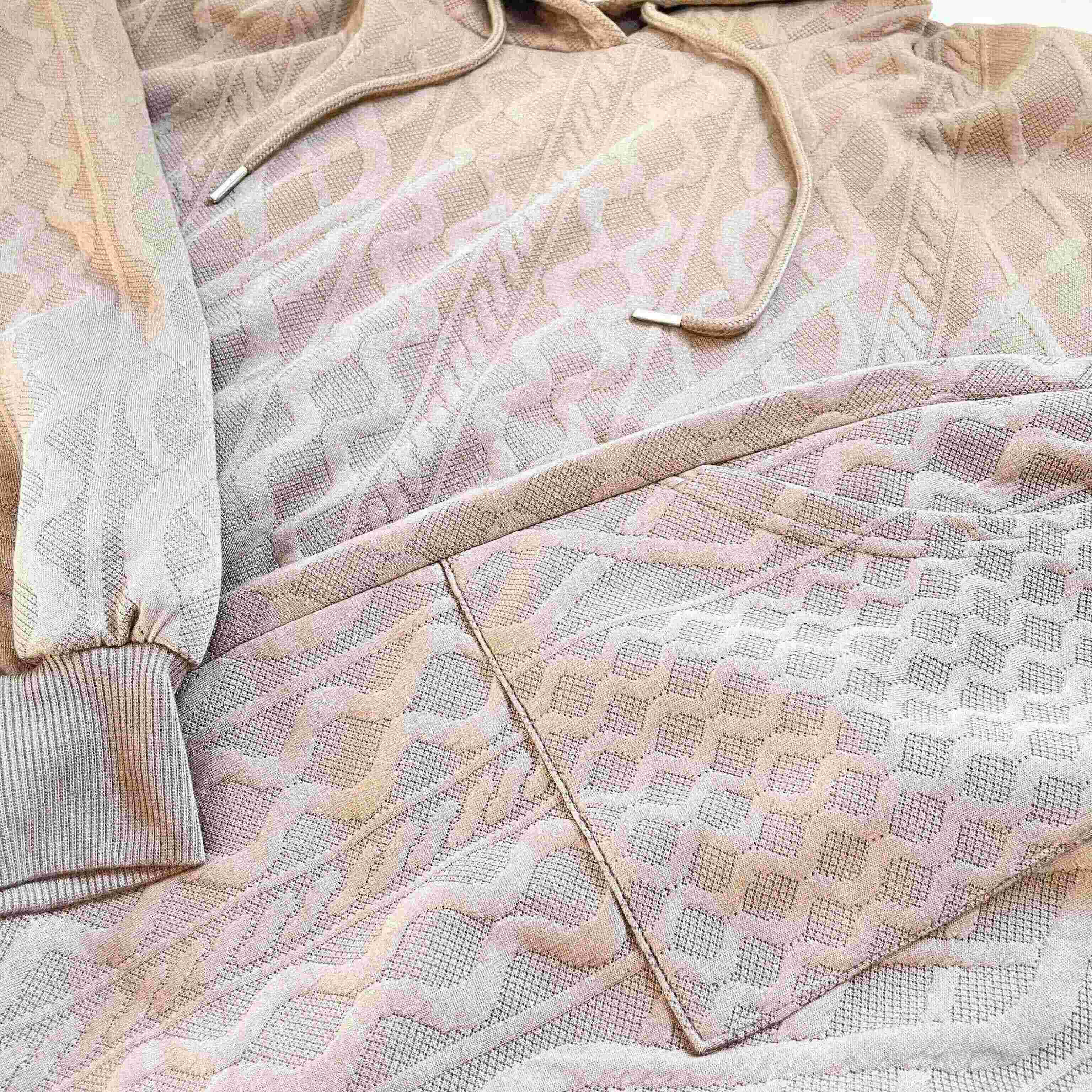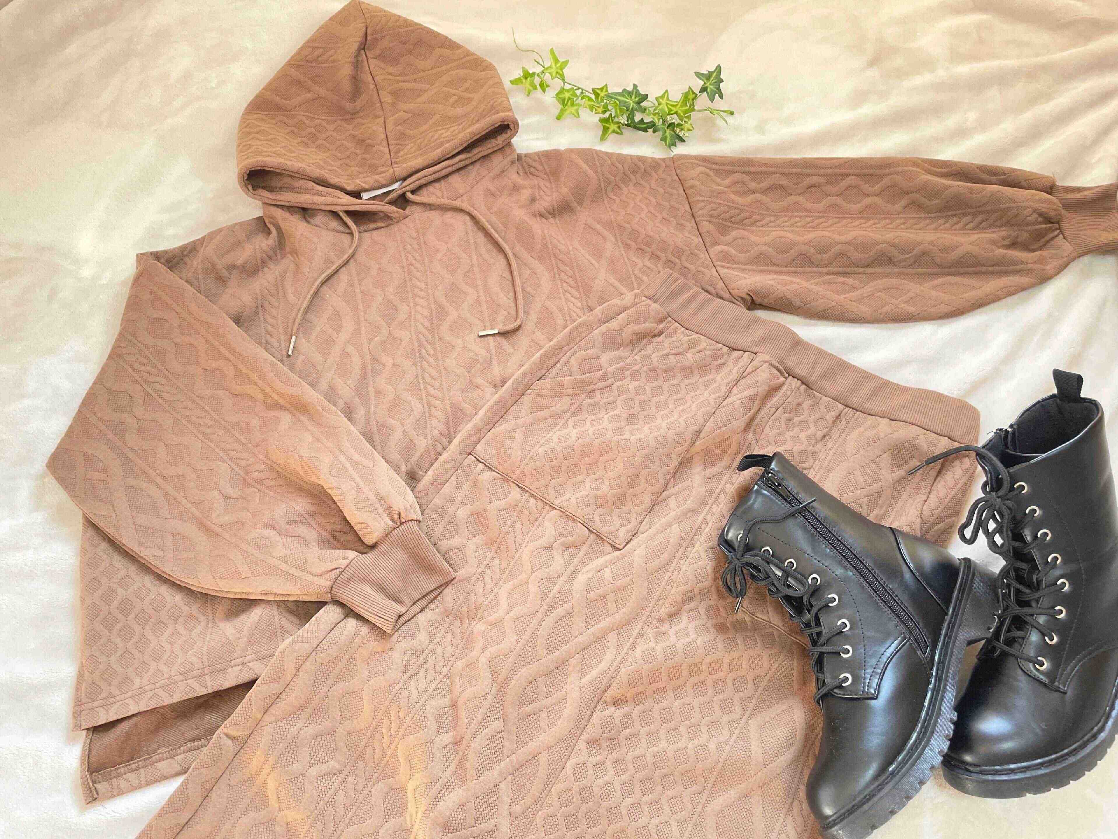 編み模様のようにポコポコした柄のデザインです。サラッと着られるので今のシーズンはこのセットアップだけで外出もできそうです。
