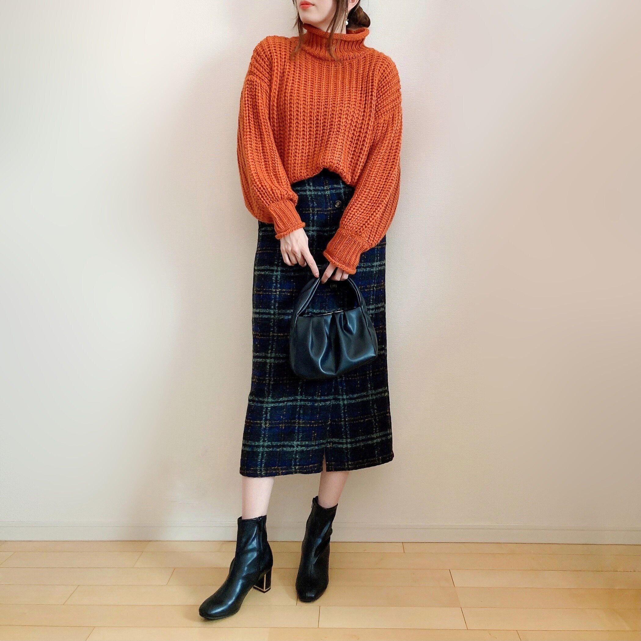 パッと目を引くオレンジの派手カラーニットですが、チェックスカートにオレンジが入っているので馴染みました。小物はブラック合わせで大人っぽくまとめています。