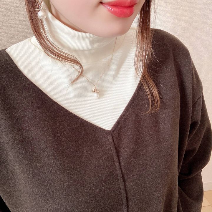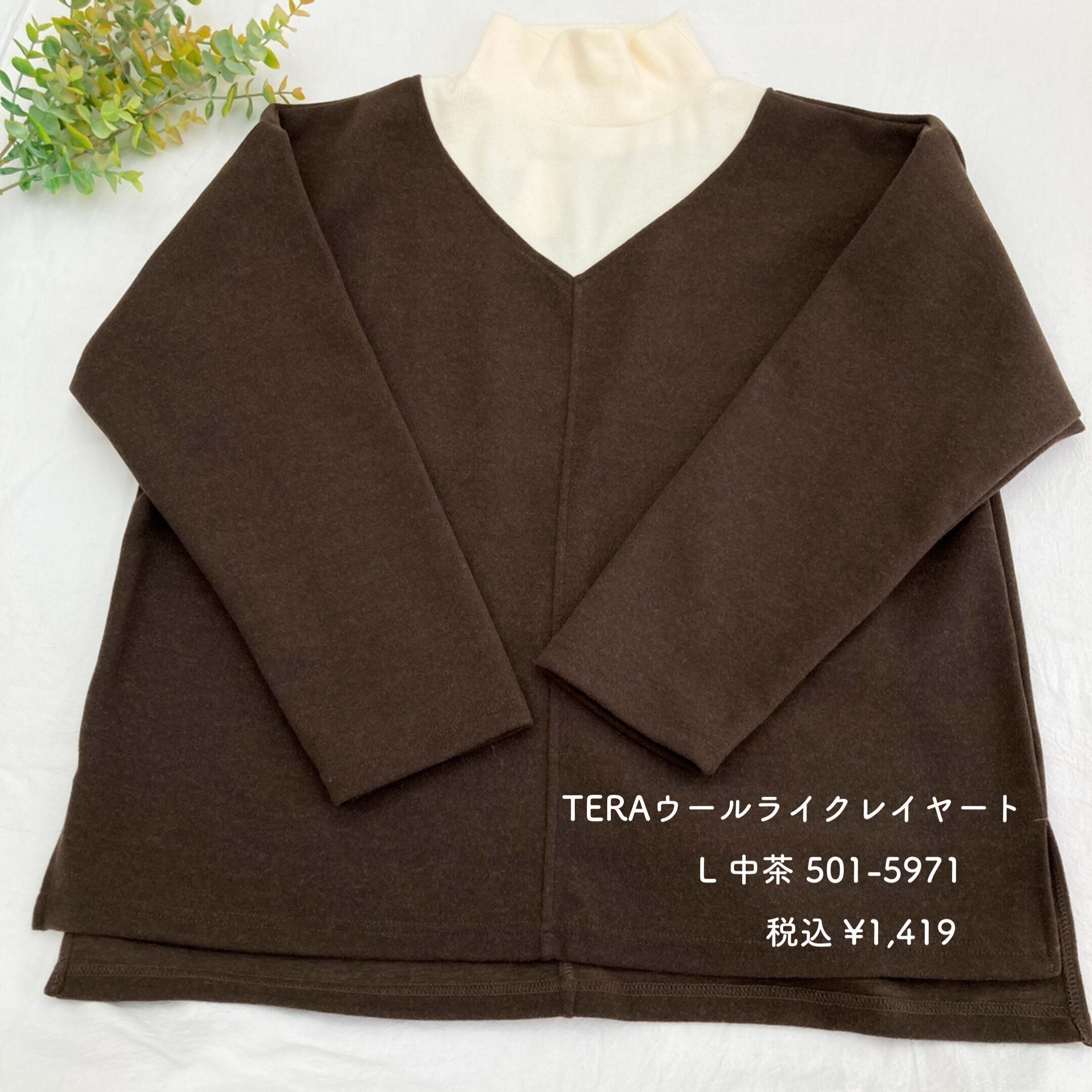 まるでウールのような質感のカットソーと、ハイネックのテレコインナーを重ねているように見えるレイヤード風トップスです。ブラウン、ベージュ、グレーの3色展開。