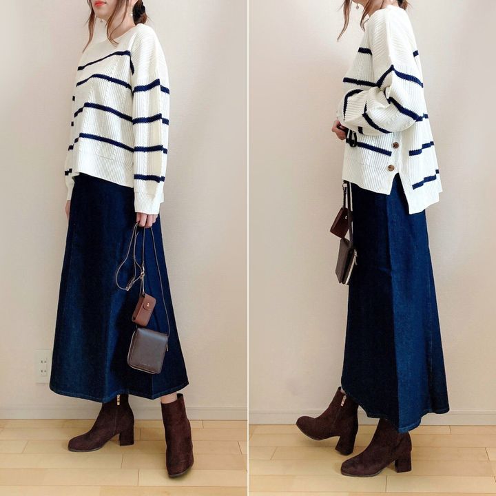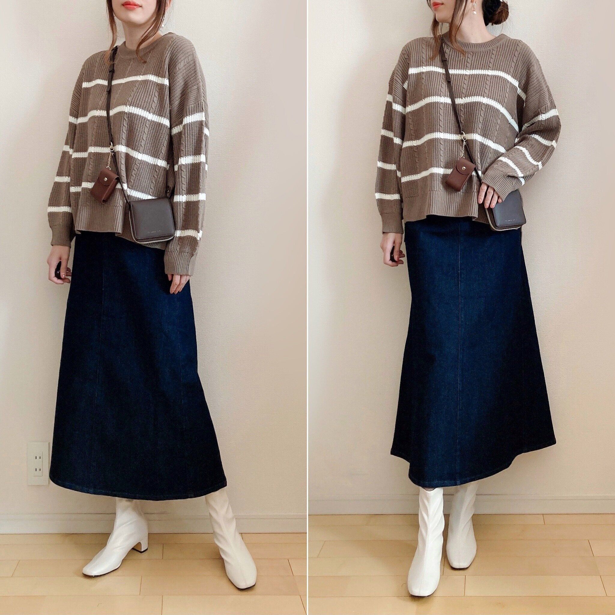 ブラウンのボーダーニットとデニムスカートも合わせてみました。ボーダーのホワイトにあわせて足元もホワイトのブーツに。