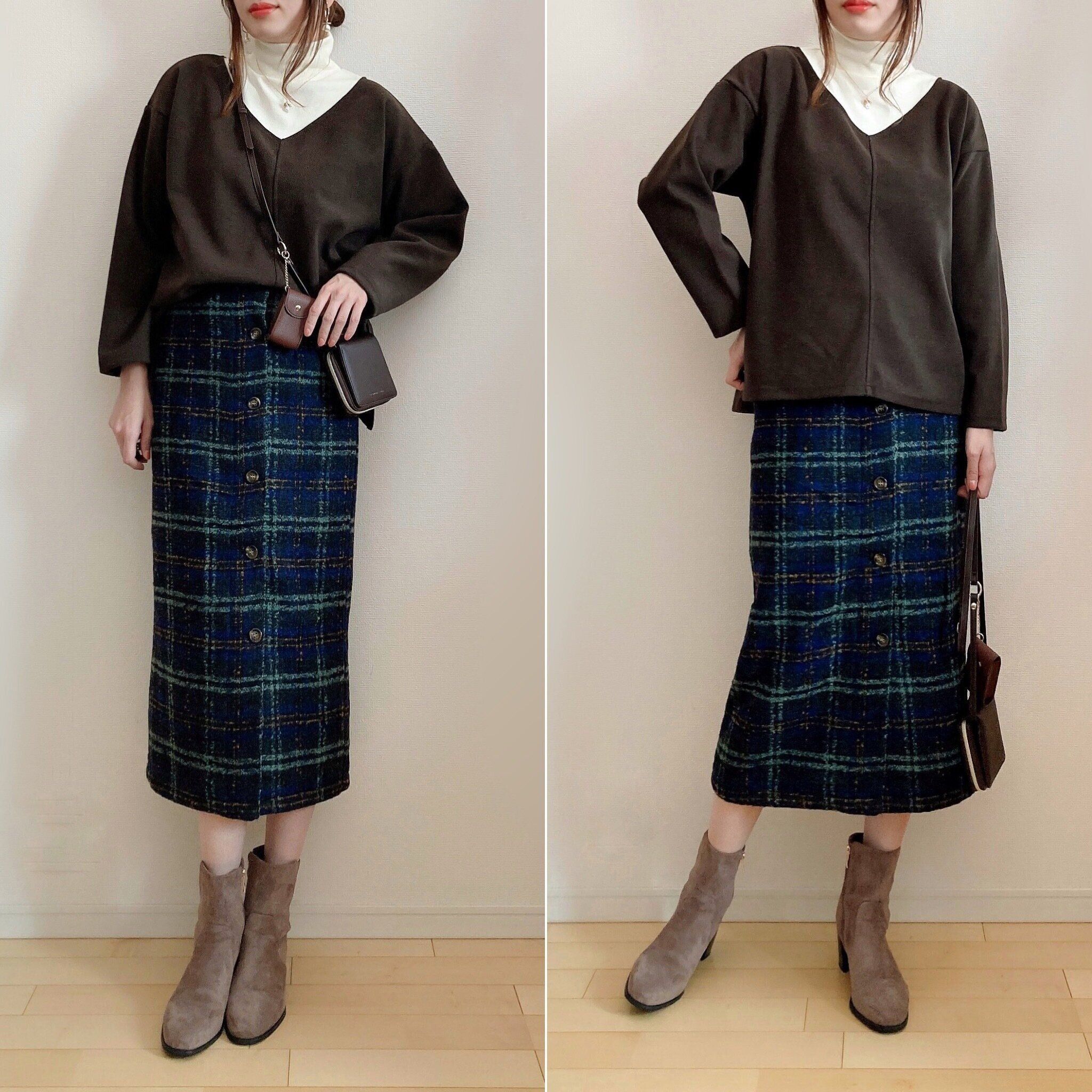 チェックスカートに、今年も人気継続中のチャンキーニットを合わせてみました。こちらはTERAさんコラボの商品ではなく、しまむらで現在販売中のものです。