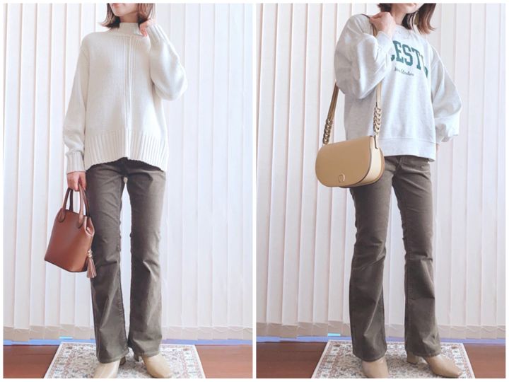 私が毎年秋冬に愛用しているコーデュロイパンツ。今年はきれいなフレアシルエットになって登場しています。
