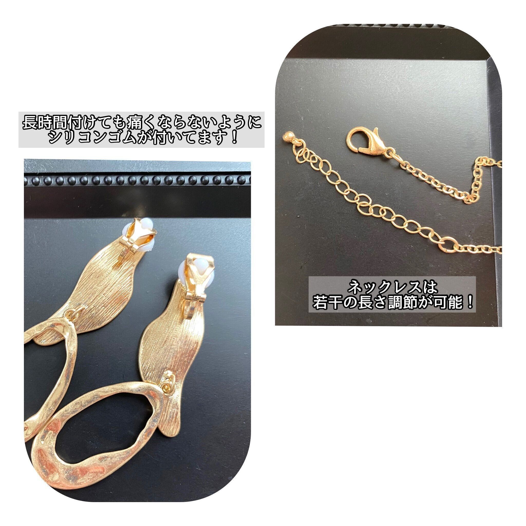 イヤリングの金具にはシリコンゴムが付いており、長時間付けても耳が痛くなりにくい仕様です。ネックレスは引っかける部分で長さの微調整が可能です!