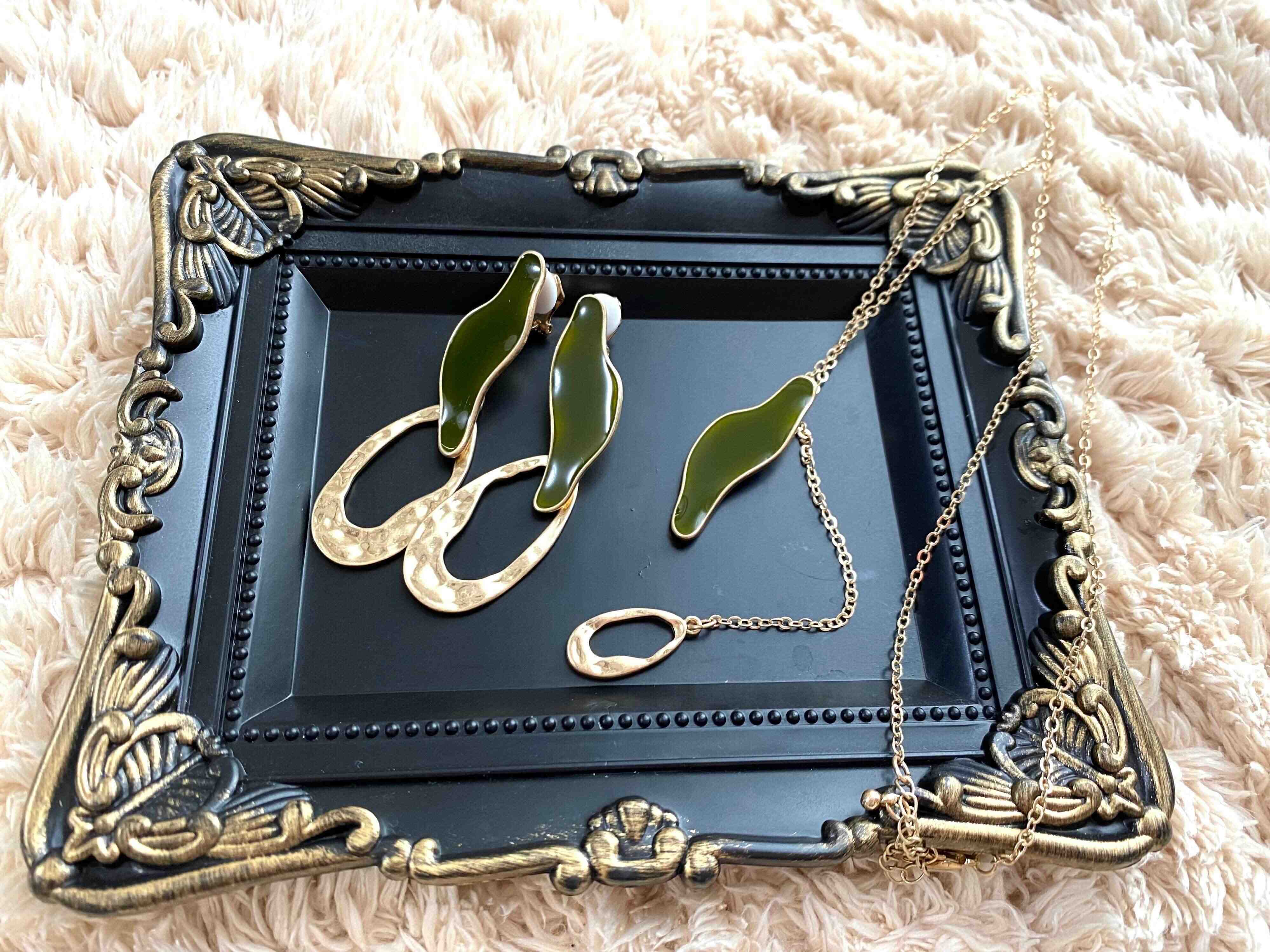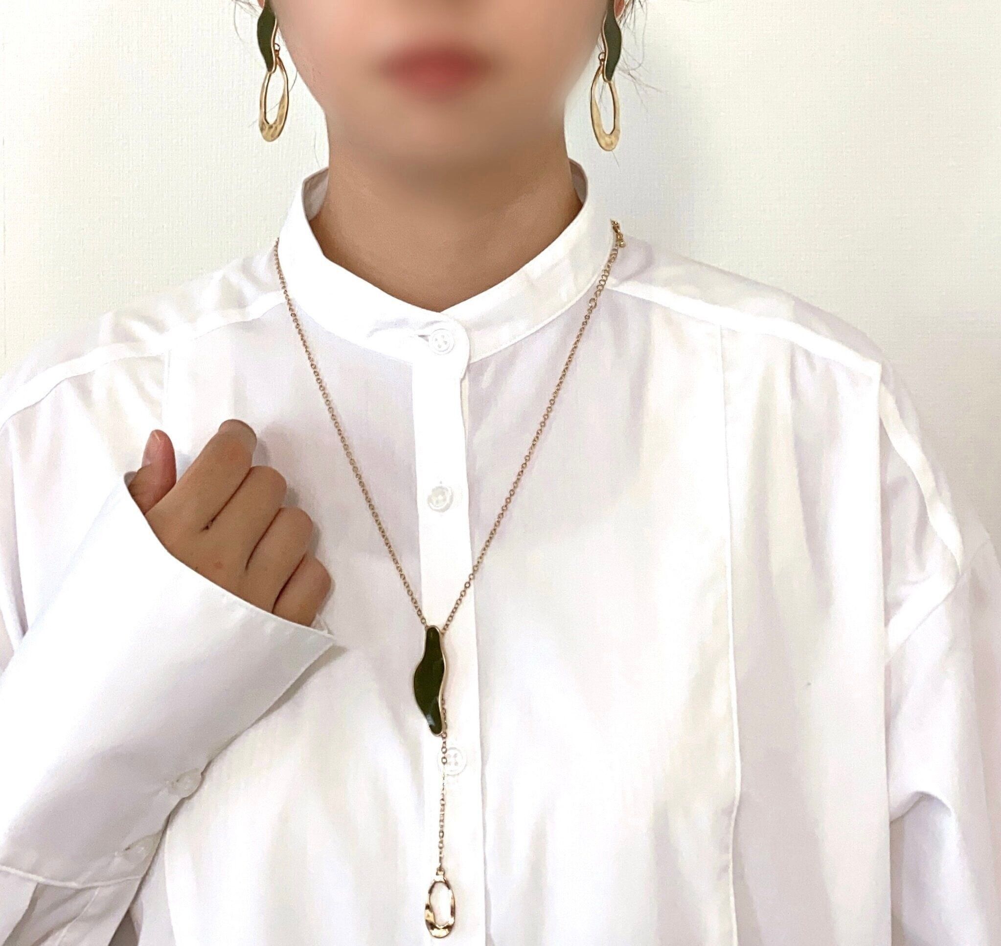 ネックレス自体にダークグリーンの色が入っているのですが、色自体にあまり主張がないのでカラーアイテムがトレンドの今もいろんなコーデに合わせやすいネックレスです。
