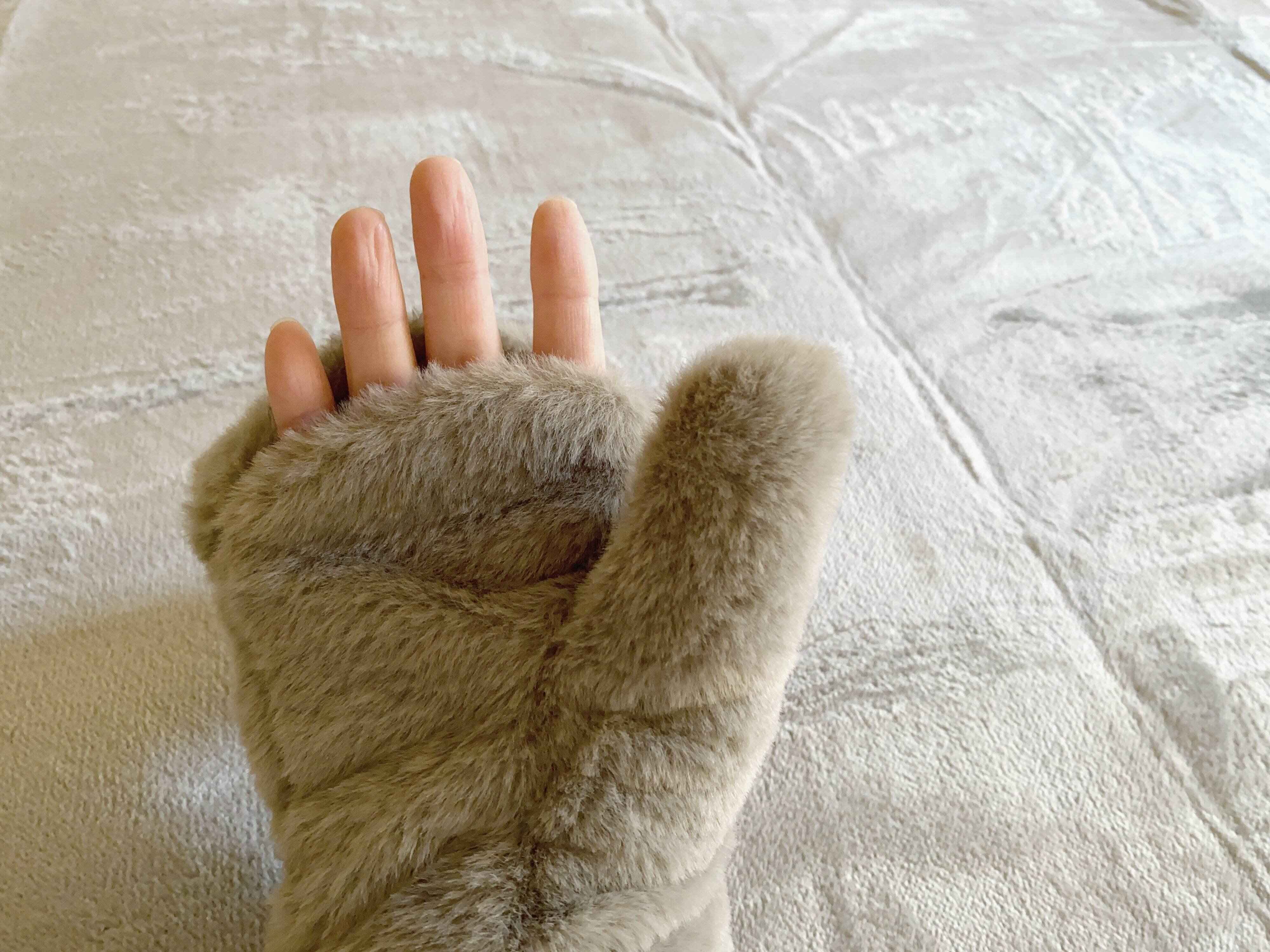 指先の部分がパカっと開くようになっていて、スマホを使いたい時に開くだけ。冬に外でスマホを触っていると手がかじかんでしまったり乾燥が気になるところですが、これなら露出するのが指先だけなので最小限の寒さに抑えられ、手の乾燥も防げます。