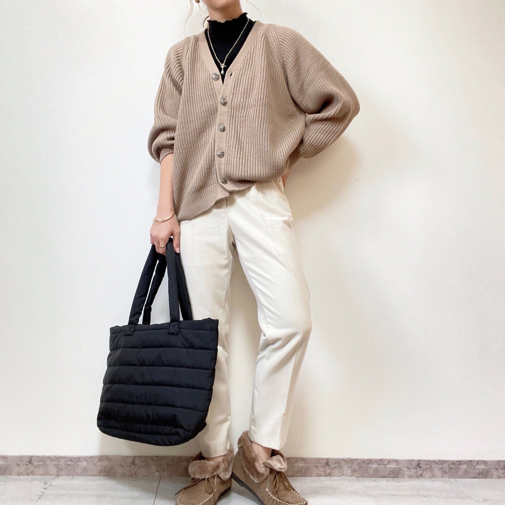 テーパードパンツと相性が良いカーディガン合わせは、ゆるっと楽ちんなのにキチンと見え。普段のコーディネートに取り入れやすい組み合わせです。