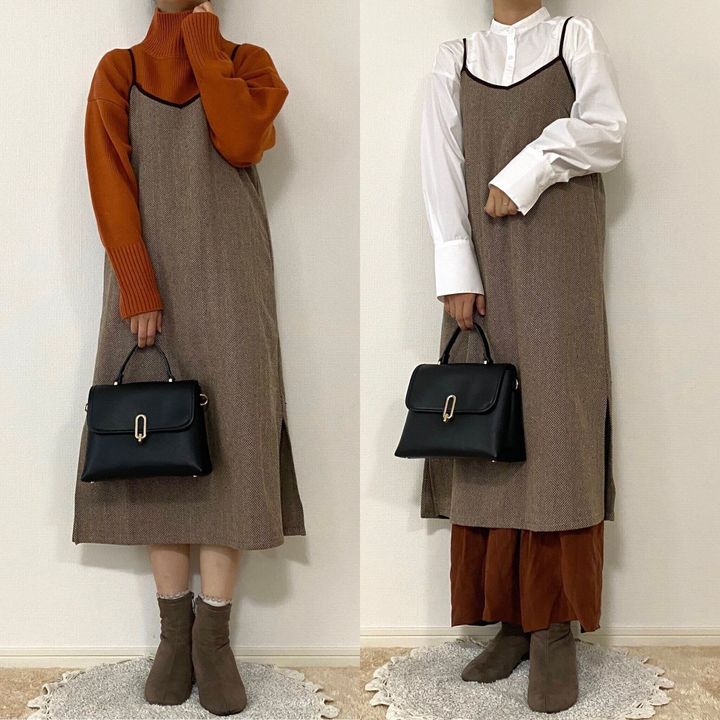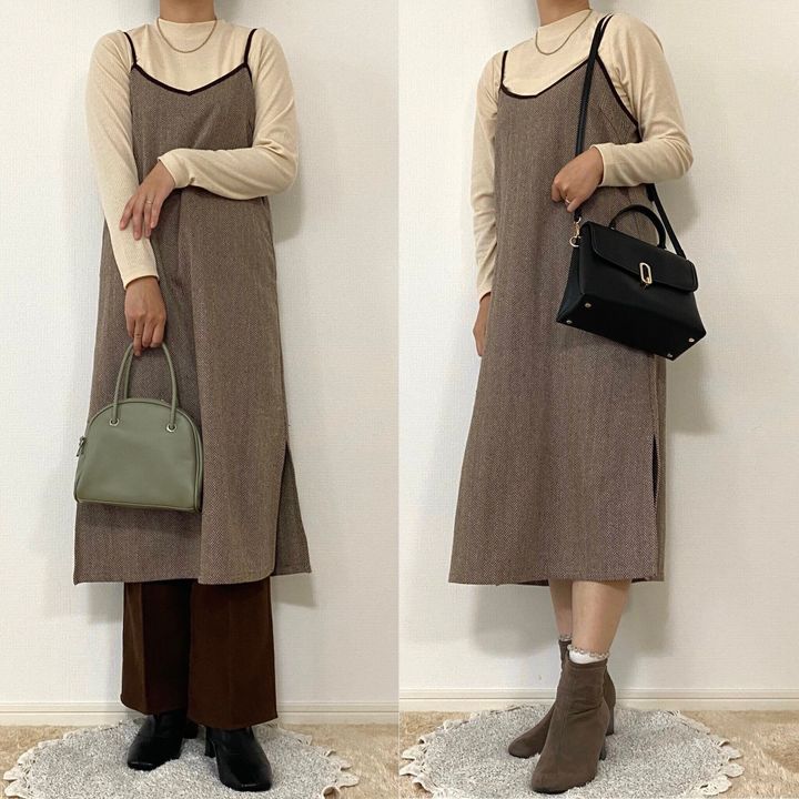 左はセットのロンTとの組み合わせにボトムは薄色デニムをインして少しカジュアル要素をプラス。ヘリンボーン柄でトレンド感がありながら、キャミソールワンピースのシルエットが女性らしさもありデニムとのバランスも良いですね。