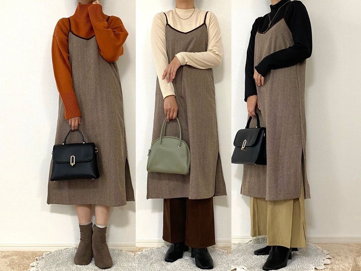 今トレンドのヘリンボーン柄のキャミソールワンピースをご紹介します。着回し力抜群のインナートップスとセット売りになっているのが嬉しいです!