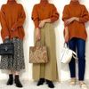 左はオレンジニットと合わせてみました。コーデのポイントになるオレンジカラーの投入でコーデの雰囲気が一気に変わりますね。ブラウンとの相性も良さそうです。
