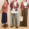 左のコーデはボトムに同系色のブラウンフレアパンツを履いてゆるっとシルエットでコーディネートしてみました。差し色にくすみグリーンのバッグを。