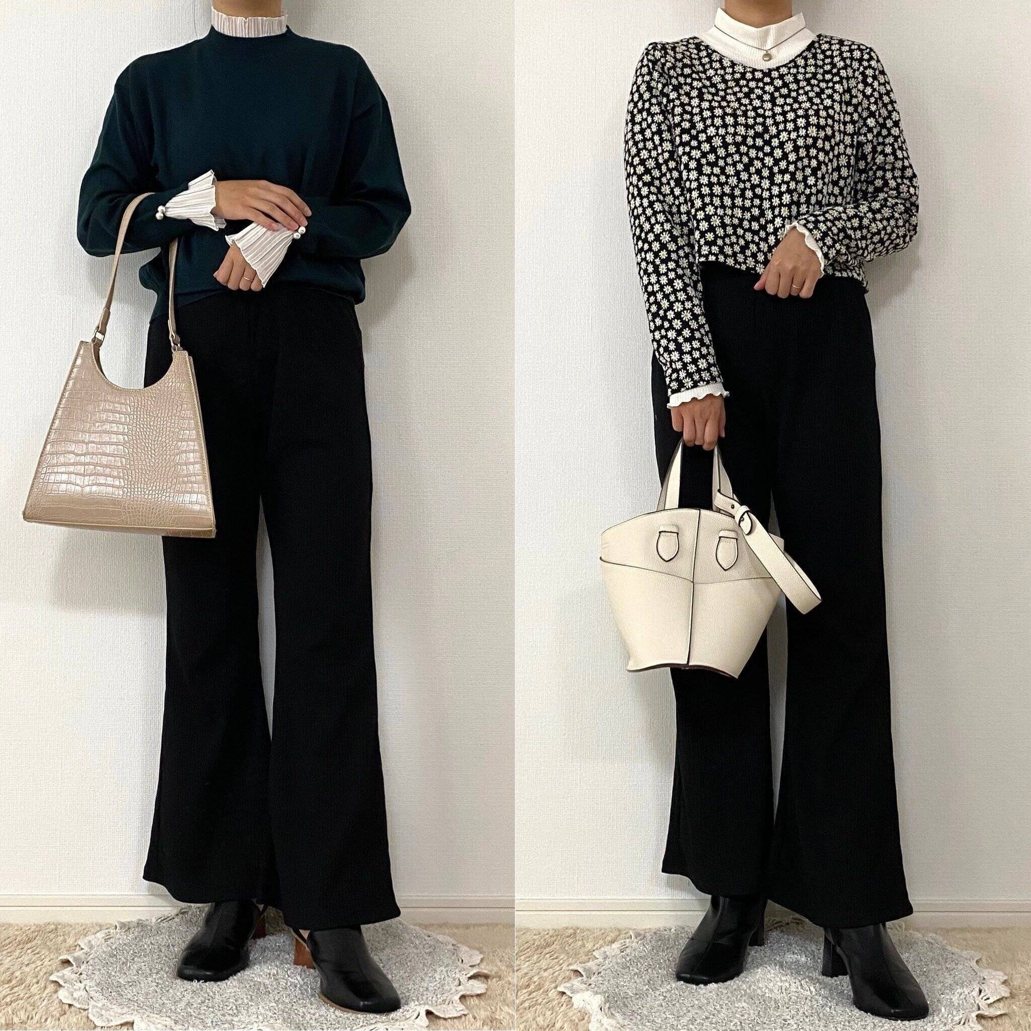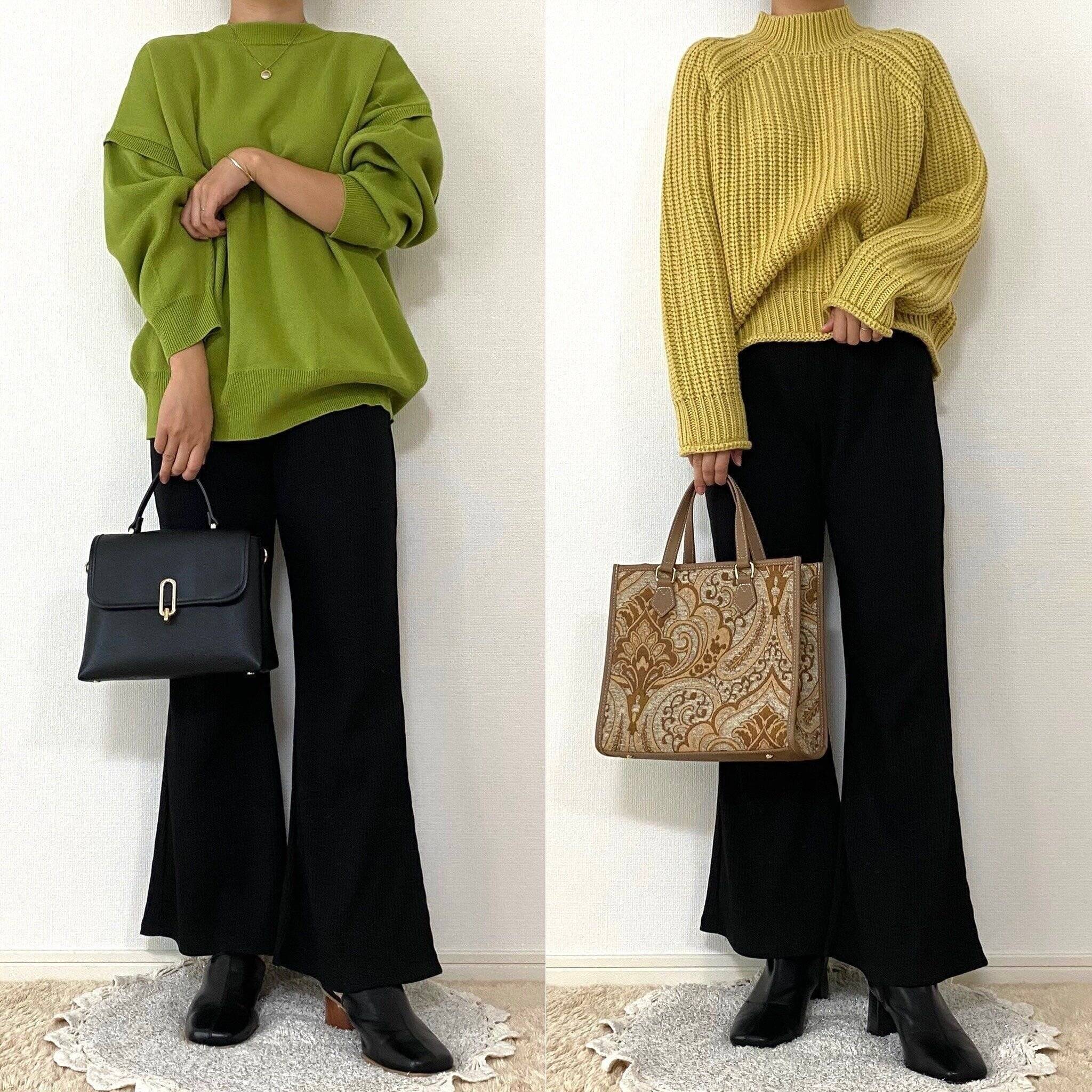 そんな時にブラックのパンツが一枚あるとどんな色のカラーニットとも相性抜群で大活躍してくれそうですよ!フレアシルエットもトレンド感があって素敵です。