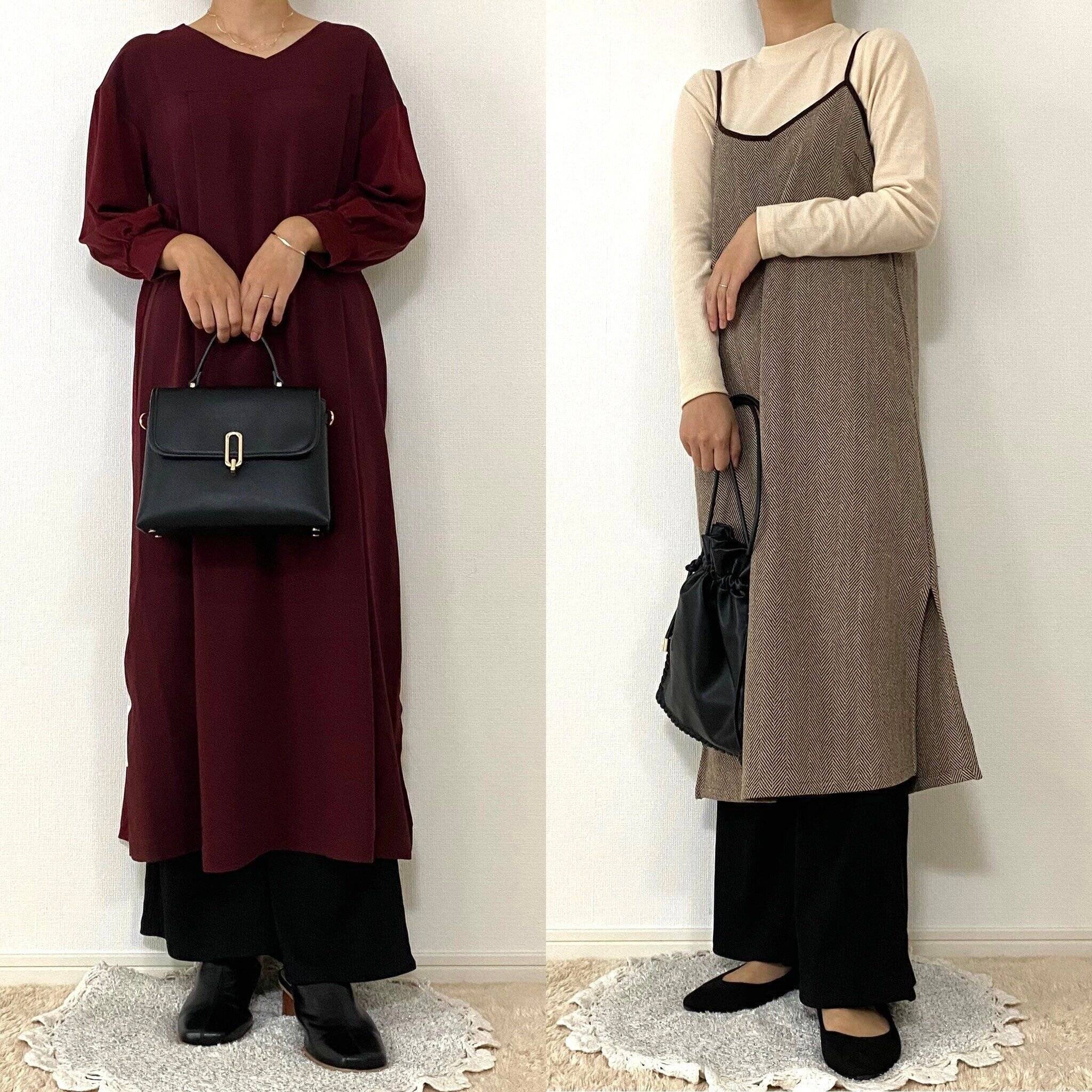 左は綺麗目なボルドーのワンピースの下に履いて楽ちんなのにどこか上品なコーデに。