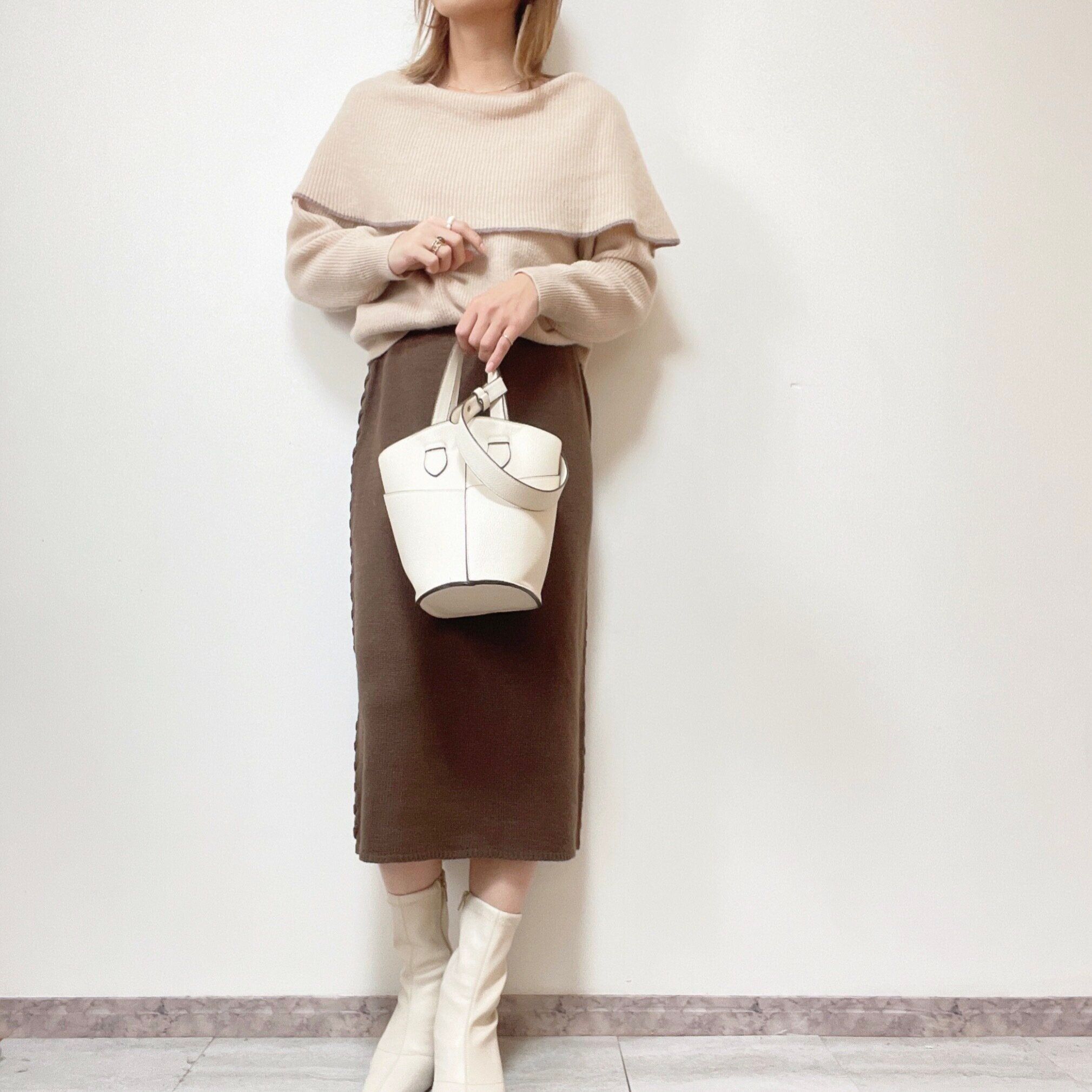 スッキリとしたペンシルスカートとも相性抜群。こちらはニットスカートですがタイトなシルエットなのでニット×ニットでも重たくならずにコーディネートが完成しました。
