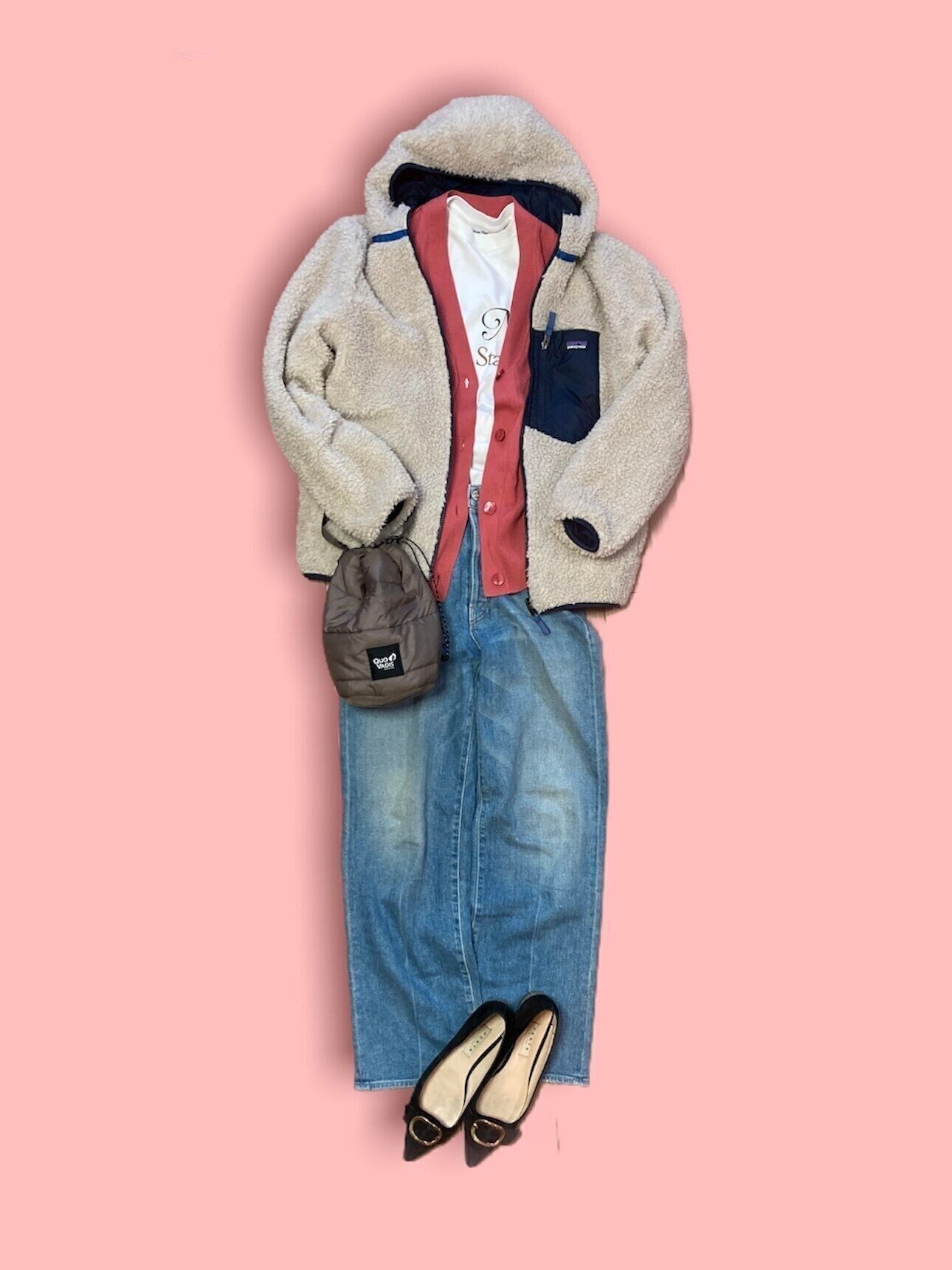 カットソー×カーディガン×ボアアウターで冬しかできないレイヤードコーデ。カーディガンの色をチラッと見せるのもポイントです。