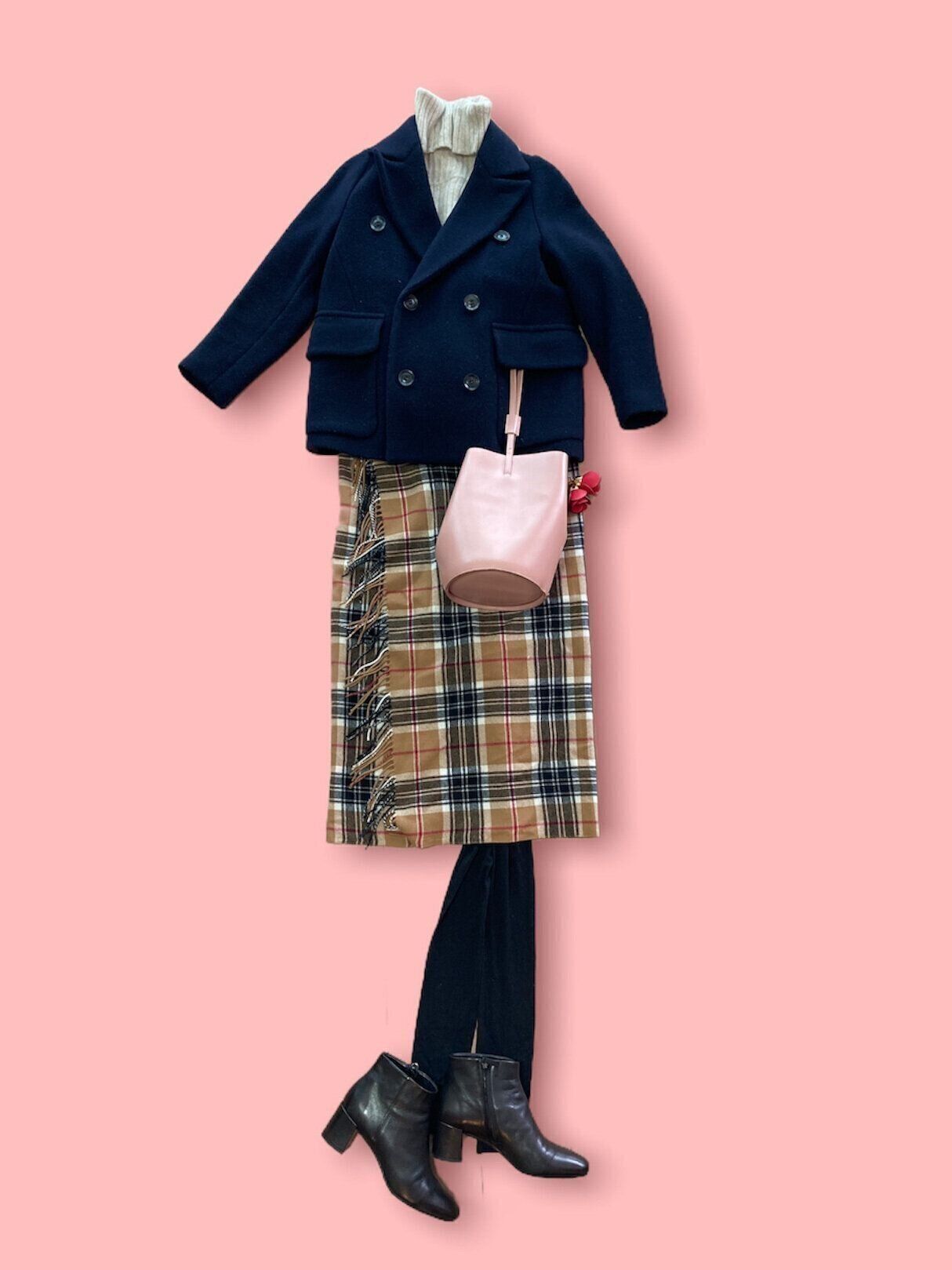 チェック柄スカートを主役にしたコーディネート。ショート丈のアウターを合わせることでタイトスカートの長さが強調できます。足元はブーツでシックに。