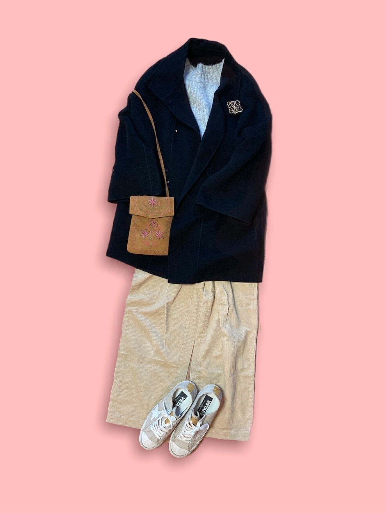 季節感がアップできるコーデュロイパンツで作るカジュアルコーデ。シックなトーンでシンプルに。刺繍の入ったバッグで個性を!