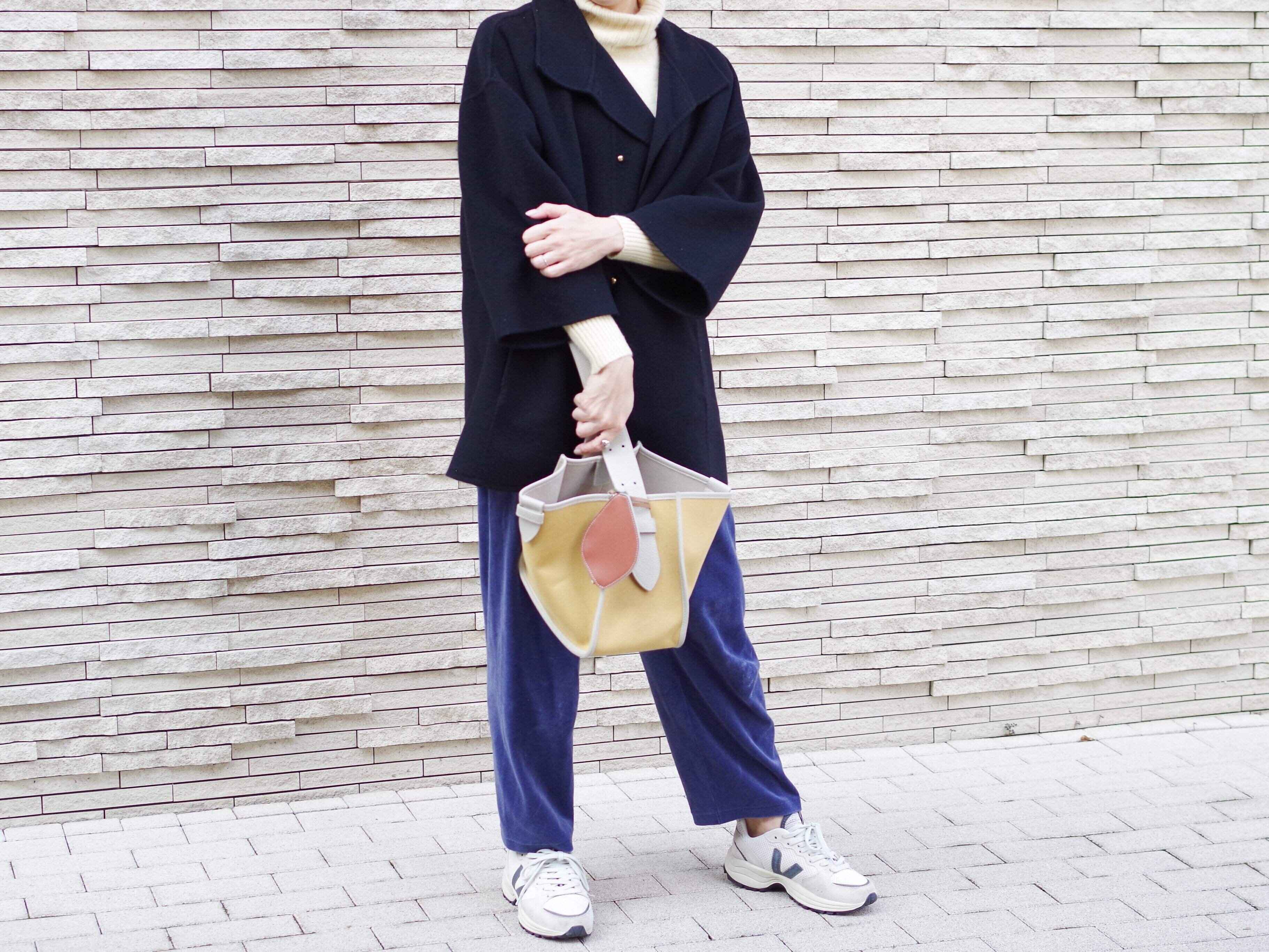 明るいイエローのタートルネックニットには、ベロアパンツにコートを。ボリュームスニーカーでクリーンな雰囲気を意識して。
