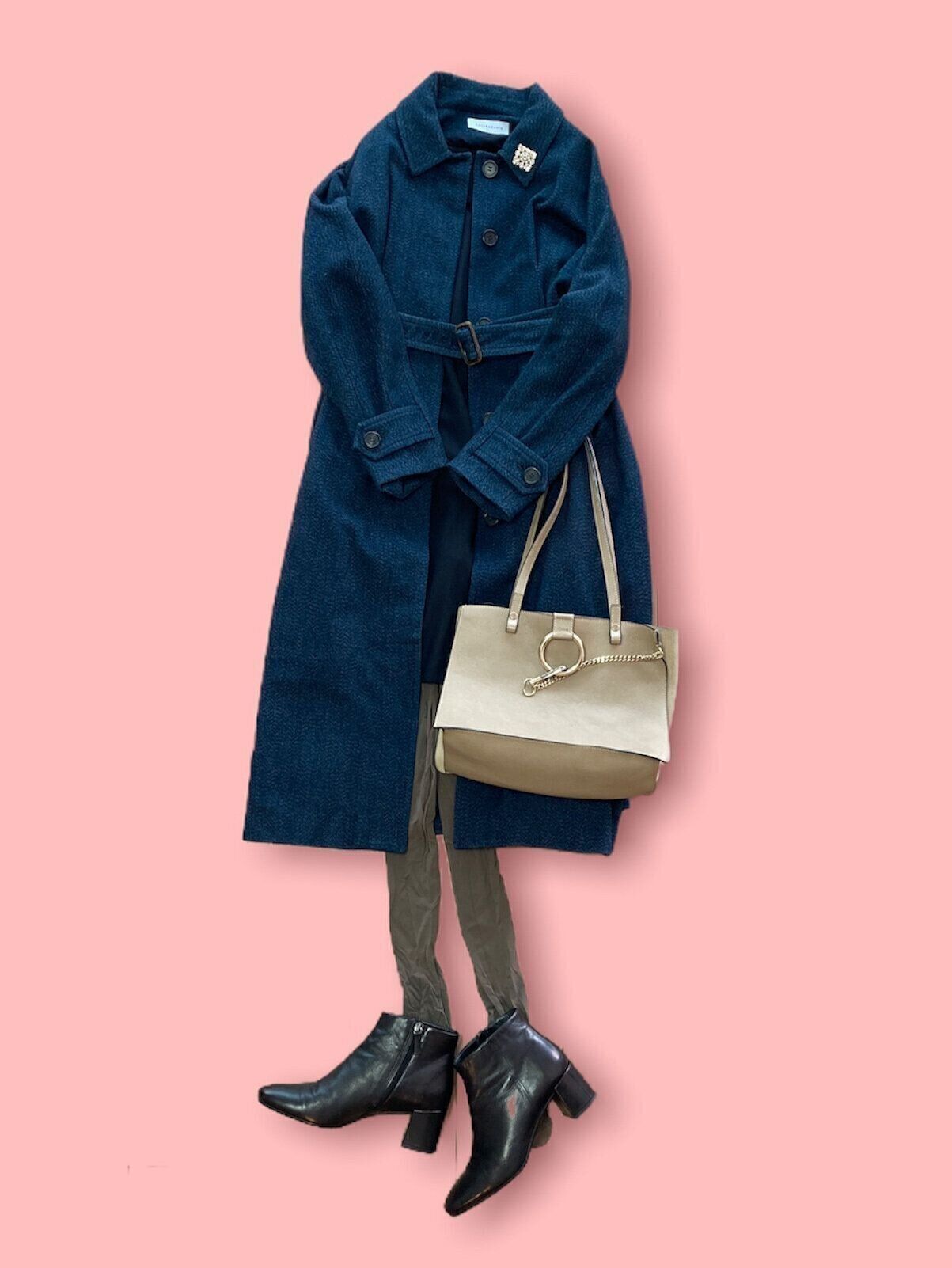 ウールのワンピースとベルトつきのロングコートなら、きちんとしたシーンにもマッチ。年末年始の挨拶、親戚の家など普段合わない人に会うシーンにもぴったりです。グレータイツ、モカ色のタイツもニュアンスが出せて◎。