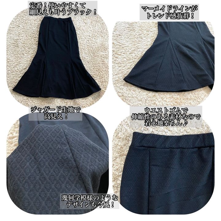 マーメイドラインでトレンド感のあるシルエットです。ジャガード生地は幾何学模様が浮き出たように見えるデザインでとても高見えします!ブラックだとそれほど柄の主張が強くないので他のカラーアイテムや柄物とも相性が良さそうです。