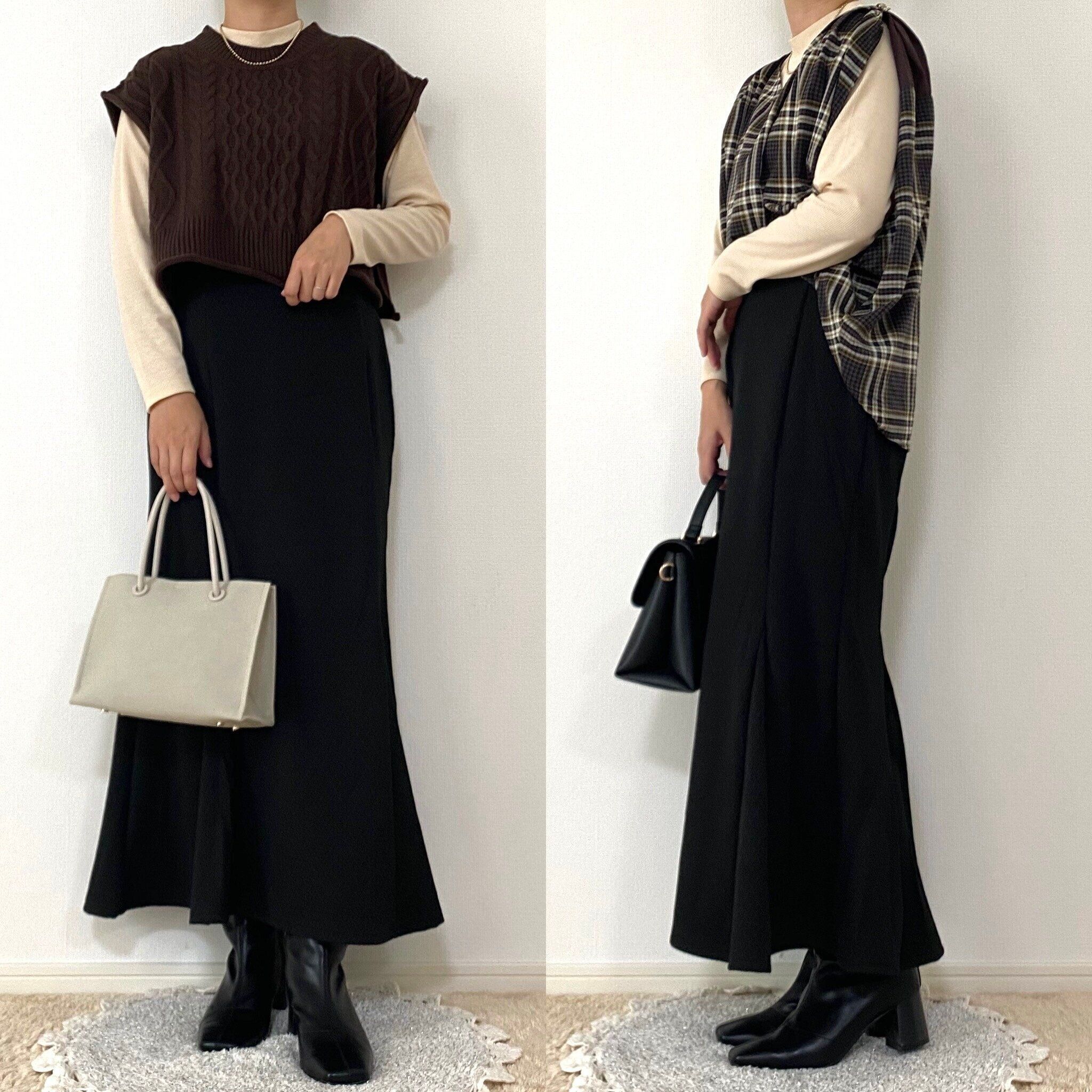 腰張り体型が悩みの私はマーメイドスカートだと骨盤の広さが目立ってしまう気がして今まで避けてきました。しかしブラックなら細見え効果も期待できますし、長め丈のトップスでお尻までカバーしてしまえば腰回りも気になりません!