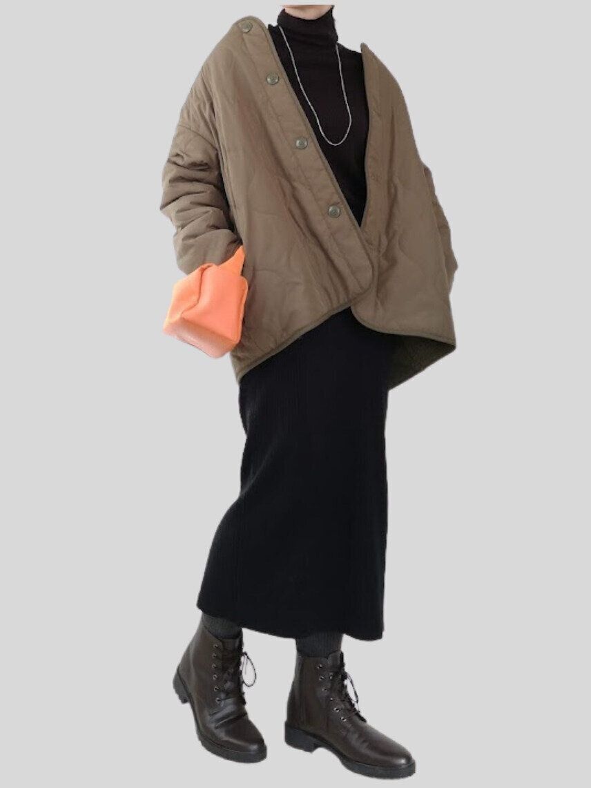 ノーカラーのロングコートや、フードなしのダウンジャケットのインにおすすめです。
