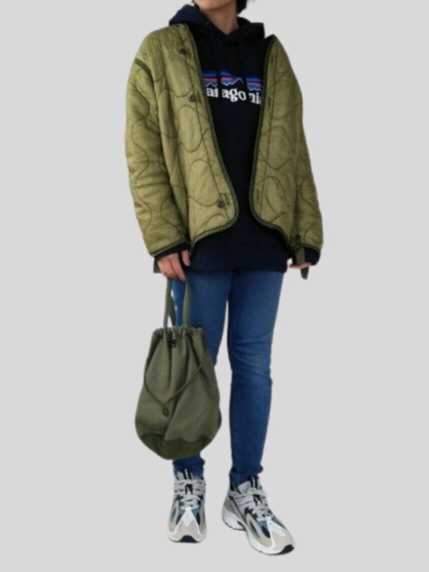 フードなしのアウターに合わせることで、すっきりした印象に。