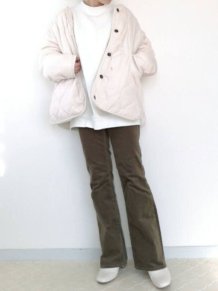フレアシルエットのコーデュロイパンツは、やぼったく見えないのでスタイリッシュな印象。アラフォー世代におすすめしたいアイテムです。