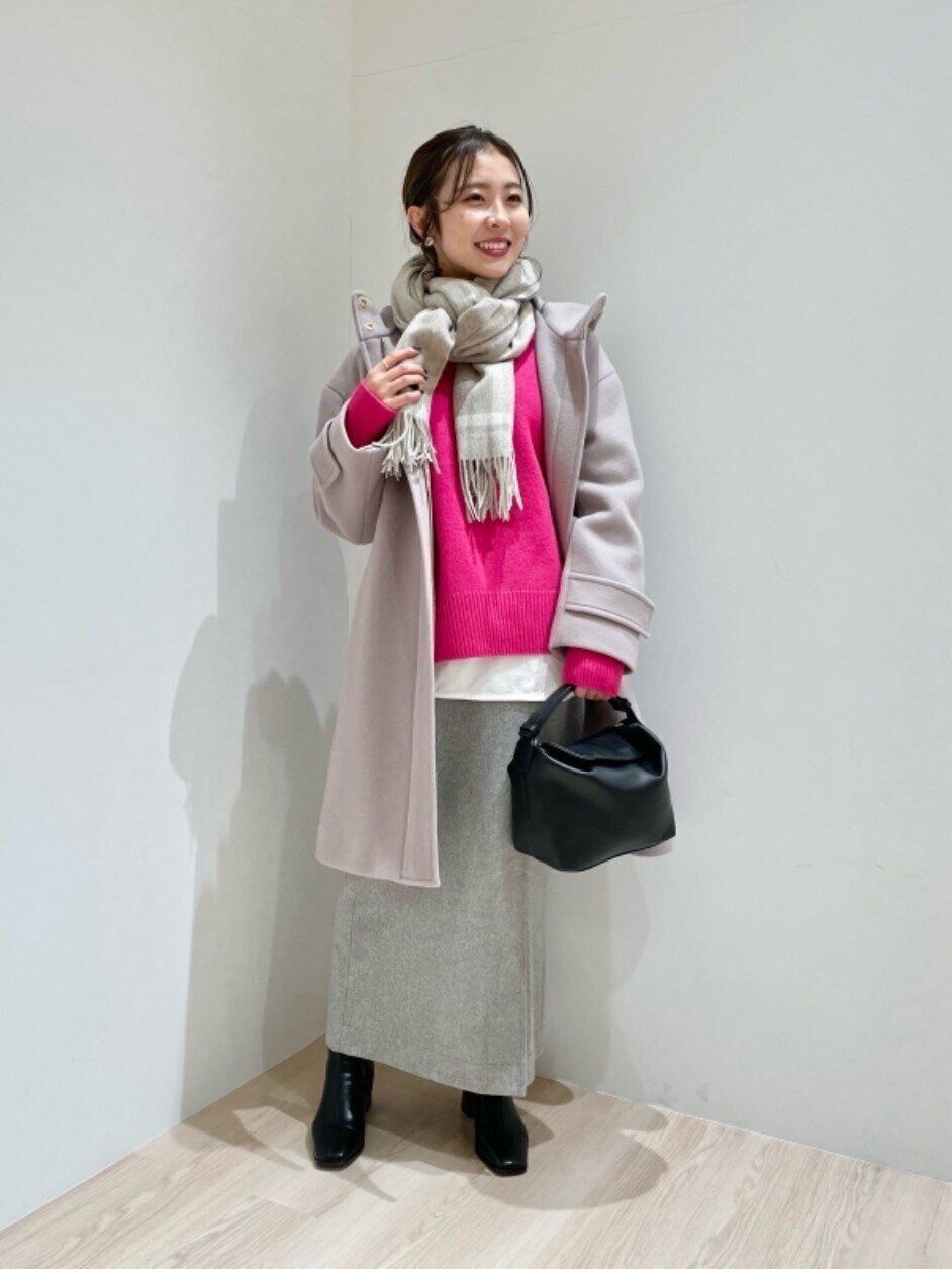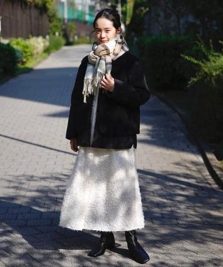 スカートやストールにカラーを入れると、冬でも華やかさのあるコーデに。