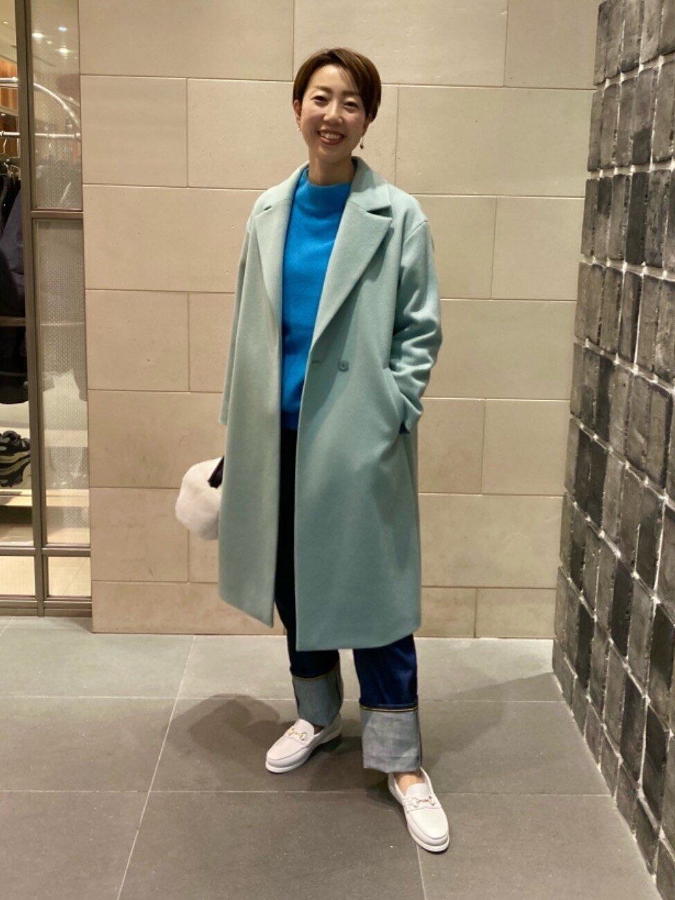 1枚持っておくと活躍するカラーニット。ニットで寒色系を選んだときは、アウターもグレーがかったカラーを選ぶとよりオシャレ度がアップします。