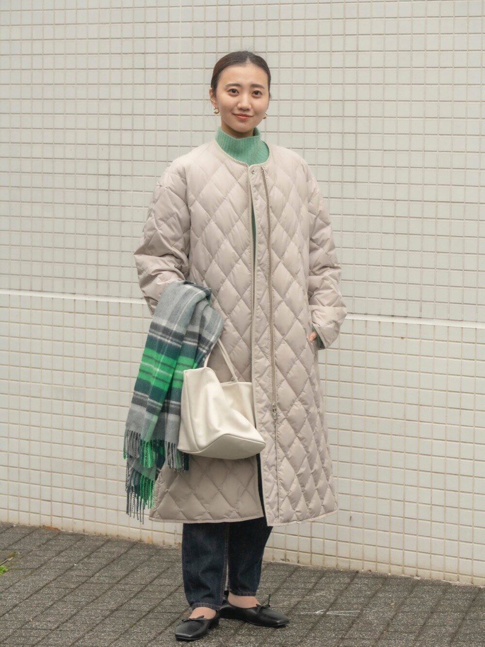 また、コートやバッグに白を合わせれば、コーディネート全体が明るい印象になります。