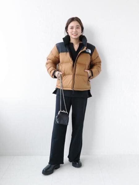ボリューム感のあるダウンコートはシャープな印象の黒のボトムを選ぶことでスッキリ見え。