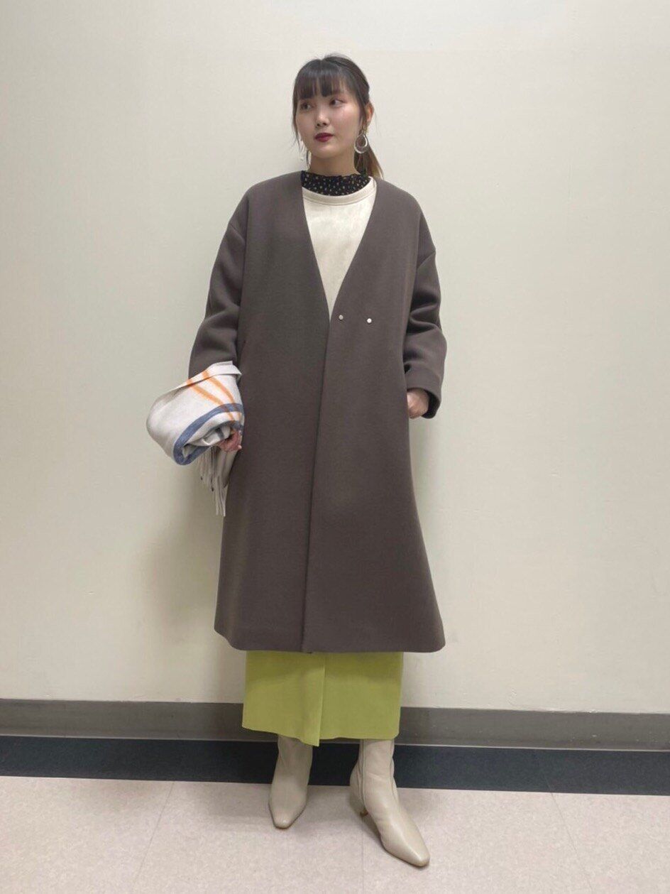 スタンドカラーのコートは着るだけでオシャレに首元を温められます。裾からカラーワンピースをチラッと覗かせることで、コーディネートに華やかさがプラスされます。